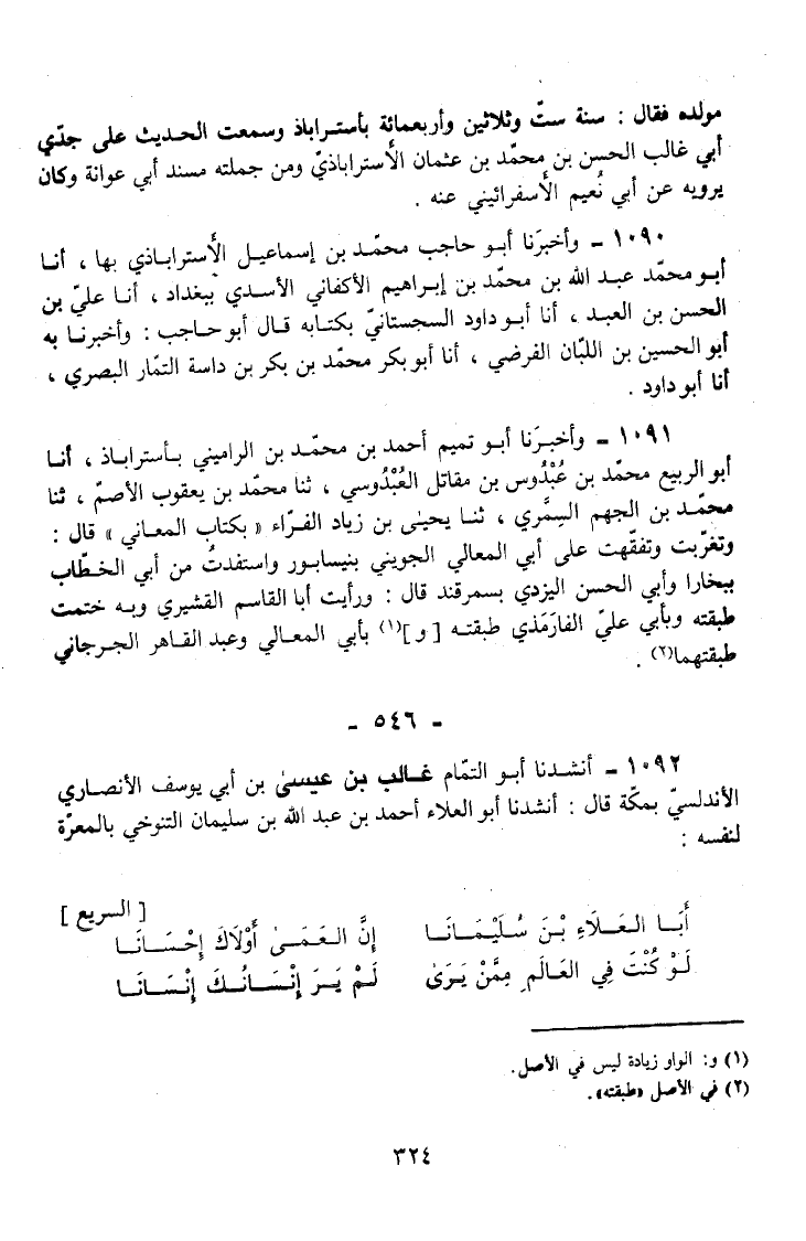 1092 - أَنْشَدَنَا أَبُو التَّمَّامِ غَالِبُ بْنُ عِيسَى بْنِ أَبِي يُوسُفَ الْأَنْصَارِيُّ الْأَنْدَلُسِيُّ بِمَكَّةَ قَالَ أَنْشَدَنَا أَبُو الْعَلَاءِ أَحْمَدُ بْنُ عَبْدِ اللَّهِ بْنِ سُلَيْمَانَ التَّنُوخِيُّ بِالْمَعَرَّةِ لِنَفْسِهِ