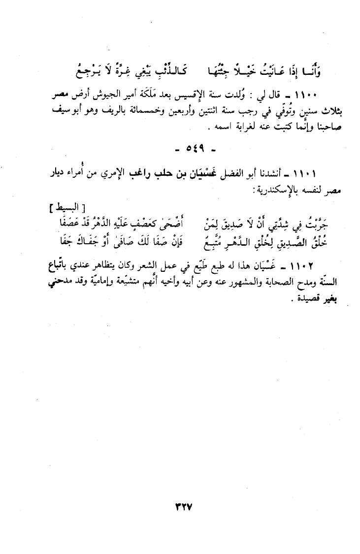 1102 - غَسْيَانُ هَذَا لَهُ طَبْعٌ طَيِّعٌ فِي عَمَلِ الشِّعْرِ وَكَانَ يَتَظَاهَرُ عِنْدِي بِاتِّبَاعِ السُّنَّةِ وَمَدَحَ الصَّحَابَةَ وَالْمَشْهُورُ عَنْهُ وَعَنْ أَبِيهِ وَأَخِيهِ أَنَّهُمْ مُتَشَيِّعَةٌ وَإِمَامِيَّةٌ وَقَدْ مَدَحَنِي بِغَيْرِ قَصِيدَةٍ.