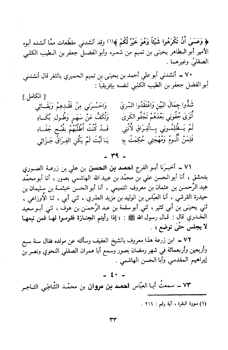 70 - أَنْشَدَنِي أَبُو عَلِيٍّ أَحْمَدُ بْنُ يَحْيَى بْنِ تَمِيمٍ الْحِمْيَرِيُّ بِالثَّغْرِ قَالَ أَنْشَدَنِي أَبُو الْفَضْلِ جَعْفَرُ بْنُ الطَّيِّبِ الْكَلْبِيُّ لِنَفْسِهِ بِإِفْرِيقِيَا