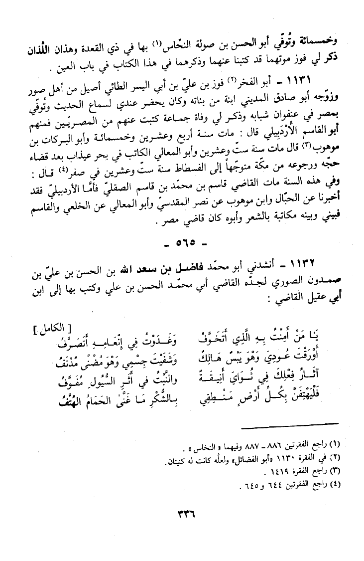1131 - أَبُو الْفَخْرِ فَوْزُ بْنُ عَلِيِّ بْنِ أَبِي الْيُسْرِ الطَّائِيَّ أَصِيلٌ مِنْ أَهْلِ صُورَ وَزَوَّجَهُ أَبُو صَادَقٍ الْمَدِينِيُّ ابْنَةً مِنْ بَنَاتِهِ وَكَانَ يَحْضُرُ عِنْدِي لِسَمَاعِ الْحَدِيثِ وَتُوُفِّيَ بِمِصْرَ فِي عُنْفُوَانِ شَبَابِهِ وَذَكَرَ لِي وَفَاةَ جَمَاعَةٍ كَتَبْتُ عَنْهُمْ مِنَ الْمِصْرِيِّينَ فَمِنْهُمْ أَبُو الْقَاسِمِ الْأَرْدُبِيلِيُّ قَالَ مَاتَ سنة أَربع وَعشْرين وَخَمْسمِائة وَأَبُو الْبَرَكَاتِ بْنُ مَوْهُوبٍ قَالَ مَاتَ سَنَةَ سِتٍّ وَعِشْرِينَ وَأَبُو الْمَعَالِي الْكَاتِبُ فِي بَحْرِ عَيْذَابَ بَعْدَ قَضَاءِ حَجِّهِ وَرُجُوعِهِ مِنْ مَكَّةَ مُتَوَجِّهًا إِلَى الْفُسْطَاطِ سَنَةَ سِتٍّ وَعِشْرِينَ فِي صَفَرٍ قَالَ وَفِي هَذِهِ السَّنَةِ مَاتَ الْقَاضِي قَاسِمُ بْنُ مُحَمَّدِ بْنِ قَاسِمٍ الصَّقَلِّيُّ فَأَمَّا الْأَرْدُبِيلِيُّ فَقَدْ أخبرنَا عَنِ الْحَبَّالِ وَابْنِ مَوْهُوبٍ عَنْ نَصْرٍ الْمَقْدِسِيِّ وَأَبُو الْمَعَالِي عَنِ الْخِلَعِيِّ وَالْقَاسِمِ فَبَيْنِي وَبَيْنَهُ مُكَاتَبَةٌ بِالشِّعْرِ وَأَبُوهُ كَانَ قَاضِي مِصْرَ.