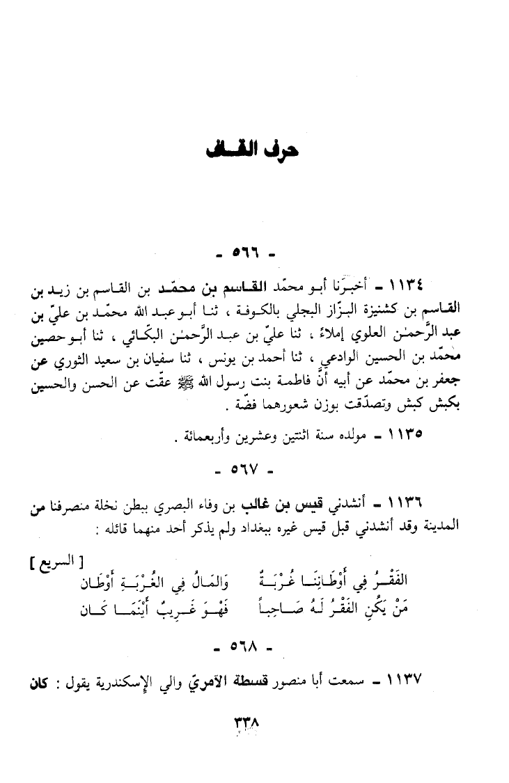 1136 - أَنْشَدَنِي قَيْسُ بْنُ غَالِبِ بْنِ وَفَاءٍ الْبَصْرِيُّ بِبَطْنِ نَخْلَةَ مُنْصَرَفَنَا مِنَ الْمَدِينَةِ وَقَدْ أَنْشَدَنِي قَبْلَ قَيْسٍ غَيْرُهُ بِبَغْدَادَ وَلَمْ يَذْكُرْ أَحَدٌ مِنْهُمَا قَائِلَهُ