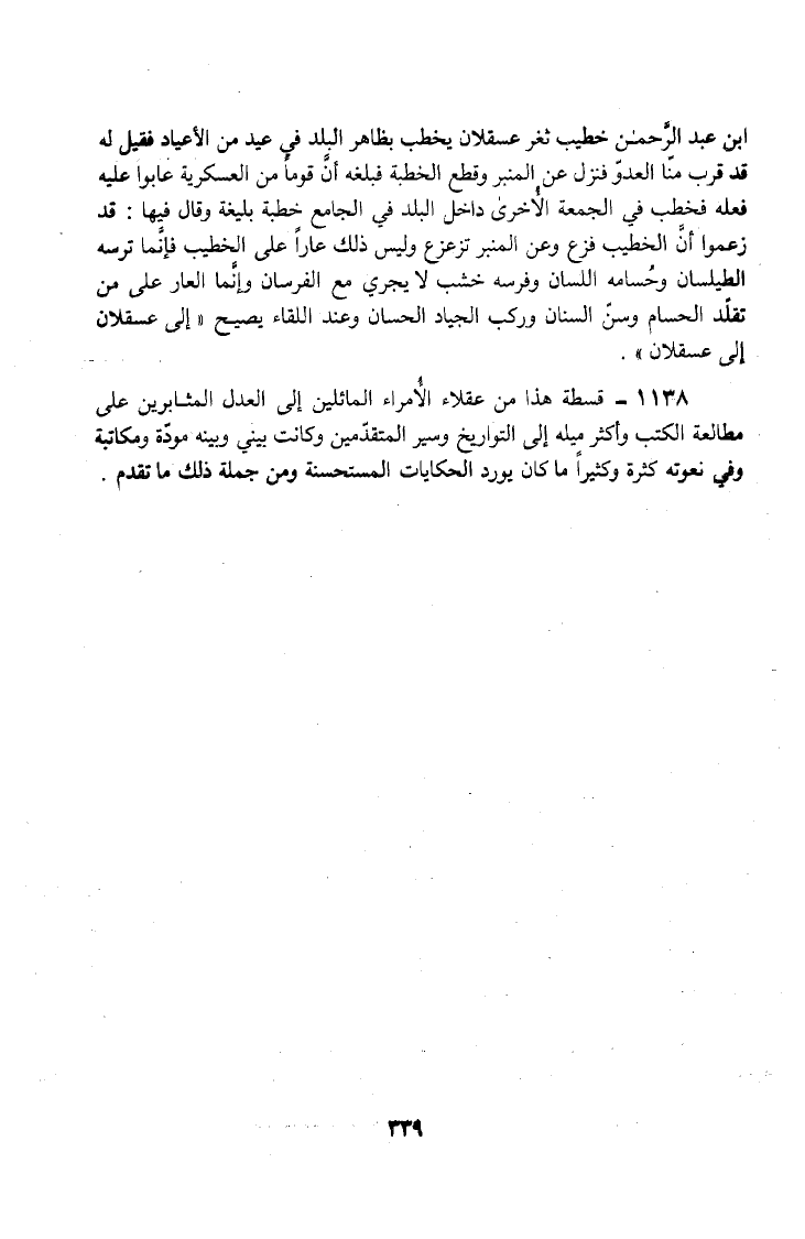 ابْنُ عَبْدِ الرَّحْمَنِ خَطِيبُ ثَغْرِ عَسْقَلَانَ يَخْطُبُ بِظَاهِرِ الْبَلَدِ فِي عِيدٍ مِنَ الْأَعْيَادِ فَقِيلَ لَهُ قَدْ قَرُبَ مِنَّا الْعَدُوُّ فَنَزَلَ عَنِ الْمِنْبَرِ وَقَطَعَ الْخُطْبَةَ فَبَلَغَهُ أَنَّ قَوْمًا مِنَ الْعَسْكَرِيَّةِ عَابُوا عَلَيْهِ فِعْلَهُ فَخَطَبَ فِي الْجُمُعَةِ الْأُخْرَى دَاخِلَ الْبَلَدِ فِي الْجَامِعِ خُطْبَةً بَلِيغَةً وَقَالَ فِيهَا قَدْ زَعَمُوا أَنَّ الْخَطِيبَ فَزِعَ وَعَنِ الْمِنْبَرِ تَزَعْزَعَ وَلَيْسَ ذَلِكَ عَارًا عَلَى الْخَطِيبِ فَإِنَّمَا تُرْسُهُ الطَّيْلَسَانُ وَحُسَامُهُ اللِّسَانُ وَفَرَسُهُ خَشَبٌ لَا يَجْرِي مَعَ الْفُرْسَانِ وَإِنَّمَا الْعَارُ عَلَى مَنْ تَقَلَّدَ الْحُسَامَ وَسَنَّ السِّنَانَ وَرَكِبَ الْجِيَادَ الْحِسَانَ وَعِنْدَ اللِّقَاءِ يَصِيحُ إِلَى عَسْقَلَانَ إِلَى عَسْقَلَانَ.