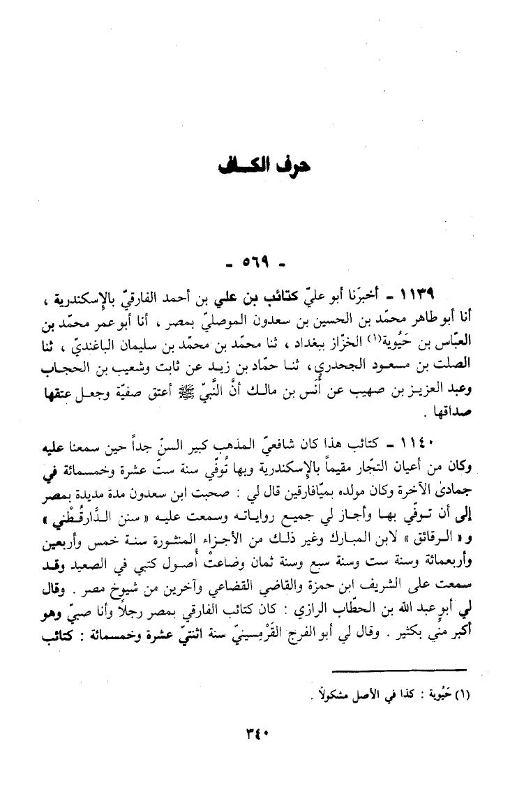 1139 - أَخْبَرَنَا أَبُو عَلِيٍّ كَتَائِبُ بْنُ عَلِيِّ بْنِ أَحْمَدَ الْفَارِقِيُّ بِالْإِسْكَنْدَرِيَّةِ أَنَا أَبُو طَاهِرٍ مُحَمَّدُ بْنُ الْحُسَيْنِ بْنِ سَعْدُونَ الْمَوْصِلِيُّ بِمِصْرَ أَنَا أَبُو عُمَرَ مُحَمَّدُ بْنُ الْعَبَّاسِ بْنِ حَيُّوَيْهِ الْخَزَّازُ بِبَغْدَادَ ثَنَا مُحَمَّدُ بْنُ مُحَمَّدِ بْنِ سُلَيْمَانَ الْبَاغَنْدِيُّ ثَنَا الصَّلْتُ بْنُ مَسْعُودٍ الْجَحْدَرِيُّ ثَنَا حَمَّادُ بْنُ زَيْدٍ عَنْ ثَابِتٍ وَشُعَيْبِ بْنِ الْحَجَّابِ وَعَبْدِ الْعَزِيزِ بْنِ صُهَيْبٍ عَنْ أَنَسِ بْنِ مَالِكٍ أَنَّ النَّبِيَّ صَلَّى اللَّهُ عَلَيْهِ وَسَلَّمَ أَعْتَقَ صَفِيَّةَ وَجَعَلَ عِتْقَهَا صَدَاقَهَا