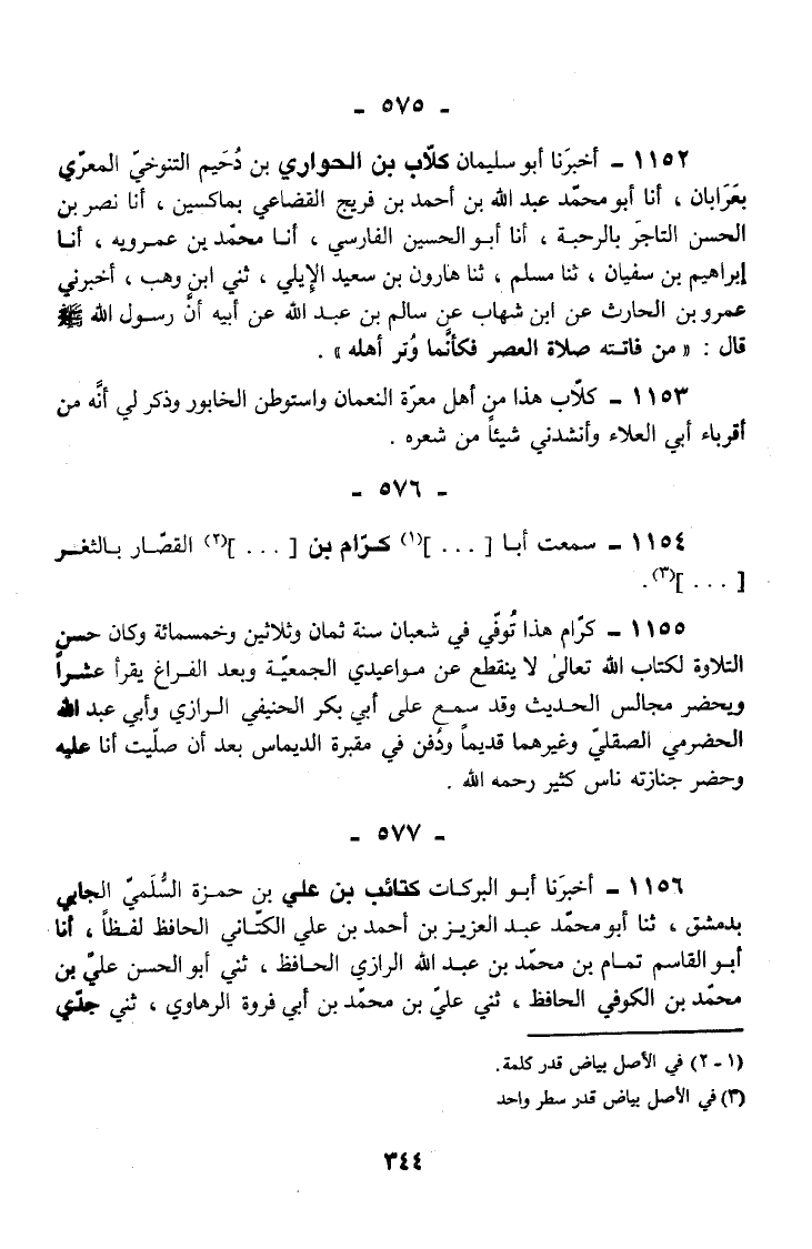 1152 - أَخْبَرَنَا أَبُو سُلَيْمَانَ كلابُ بْنُ الْحَوَارِيِّ بْنِ دُحَيْمٍ التَّنُوخِيُّ الْمَعَرِّيُّ بِعَرَابَانَ أَنَا أَبُو مُحَمَّدٍ عَبْدُ اللَّهِ بْنُ أَحْمَدَ بْنِ فُرَيْجٍ الْقُضَاعِيُّ بِمَاكَسِينَ أَنَا نَصْرُ بْنُ الْحَسَنِ التَّاجِرُ بِالرَّحْبَةِ أَنَا أَبُو الْحُسَيْنِ الْفَارِسِيُّ أَنَا مُحَمَّدُ بْنُ عَمْرَوَيْهِ أَنَا إِبْرَاهِيمُ بْنُ سُفْيَانَ ثَنَا مُسْلِمٌ ثَنَا هَارُونُ بْنُ سَعِيدٍ الْأيلِيُّ ثَنِي ابْنُ وَهْبٍ أَخْبَرَنِي عَمْرُو بْنُ الْحَارِثِ عَنِ ابْنِ شِهَابٍ عَنْ سَالِمِ بْنِ عَبْدِ اللَّهِ عَنْ أَبِيهِ أَنّ رَسُولُ اللَّهِ صَلَّى اللَّهُ عَلَيْهِ وَسَلَّمَ قَالَ مَنْ فَاتَتْهُ صَلَاةُ الْعَصْرِ فَكَأَنَّمَا وُتِرَ أَهْلُهُ
