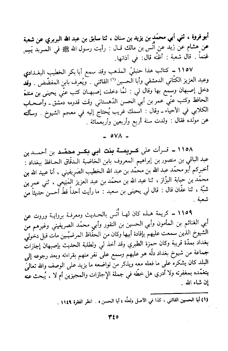 1158 - قَرَأْتُ عَلَى كَرِيمَةَ بِنْتِ أَبِي بَكْرٍ مُحَمَّدُ بْنُ أَحْمَدَ بْنِ عَبْدِ الْبَاقِي بْنِ مَنْصُورِ بْنِ إِبْرَاهِيمَ الْمَعْرُوفِ بِابْنِ الْخَاضِبَةِ الدَّقَّاقِ الْحَافِظ بِبَغْدَاد أخْبركُم أَبُو مُحَمَّدٍ عَبْدُ اللَّهِ بْنُ مُحَمَّدِ بْنِ عَبْدِ اللَّهِ الْخَطِيبُ الصَّرِيفِينِيُّ أَنَا عُبَيْدُ اللَّهِ بْنُ مُحَمَّدِ بْنِ حبَابَةَ الْبَزَّازُ ثَنَا عَبْدُ اللَّهِ بْنُ مُحَمَّدِ بْنِ عَبْدِ الْعَزِيزِ الْمَنِيعِيُّ ثَنِي عُمَرُ بْنُ شَبَّةَ ثَنَا عَفَّانُ قَالَ قَالَ لِي يَحْيَى بْنُ سَعِيدٍ مَا رَأَيْتُ أَحَدًا قَطُّ أَحْسَنَ حَدِيثًا مِنْ شُعْبَةَ