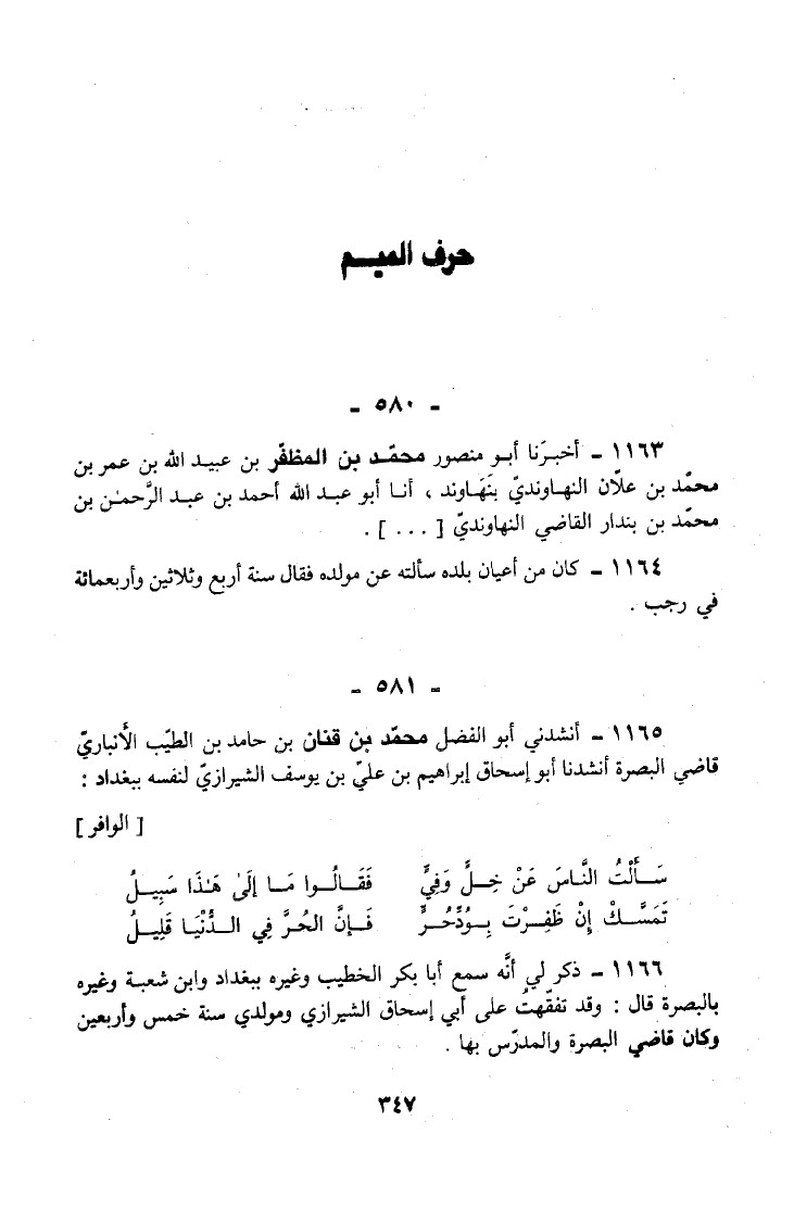 1165 - أَنْشَدَنِي أَبُو الْفَضْلِ مُحَمَّدُ بْنُ قِنَانِ بْنِ حَامِدِ بْنِ الطَّيِّبِ الْأَنْبَارِيُّ قَاضِي الْبَصْرَةِ أَنْشَدَنَا أَبُو إِسْحَاقَ إِبْرَاهِيمُ بْنُ عَلِيِّ بْنِ يُوسُفَ الشِّيرَازِيُّ لِنَفْسِهِ بِبَغْدَادَ