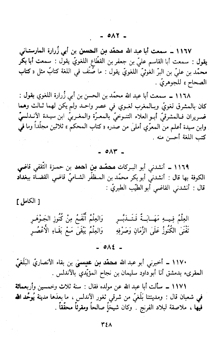 1167 - سَمِعت أَبَا عَبْدِ اللَّهِ مُحَمَّدَ بْنَ الْحَسَنِ بْنِ أَبِي زُرَارَةَ الْمَارِسْتَانِيَّ يَقُولُ سَمِعت أَبَا الْقَاسِمِ عَلِيَّ بْنَ جَعْفَرِ بْنِ الْقَطَّاعِ اللُّغَوِيَّ يَقُولُ سَمِعت أَبَا بَكْرٍ مُحَمَّدَ بْنَ عَلِيِّ بْنِ الْبَرِّ الْغَوْثِيَّ اللُّغَوِيَّ يَقُولُ مَا صُنِّفَ فِي اللُّغَةِ كِتَابٌ مِثْلُ كِتَابِ الصَّحَّاحِ لِلْجَوْهَرِيِّ