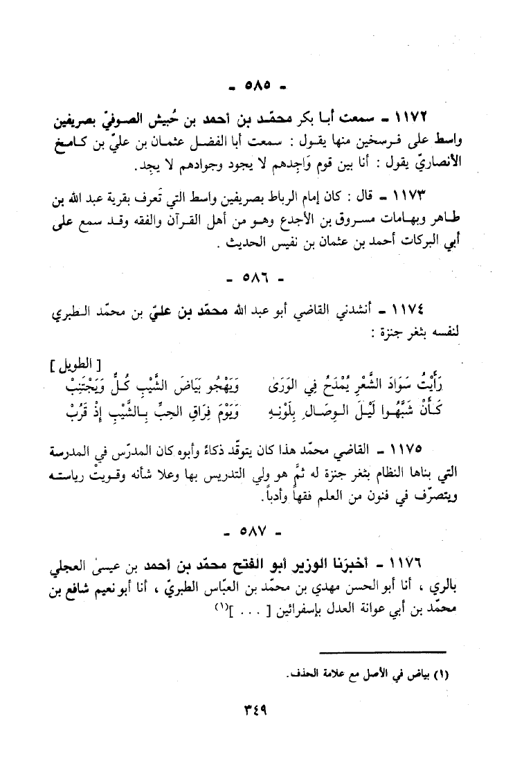 1174 - أَنْشَدَنِي الْقَاضِي أَبُو عَبْدِ اللَّهِ مُحَمَّدُ بْنُ عَلِيِّ بْنِ مُحَمَّدٍ الطَّبَرِيُّ لِنَفْسِهِ بِثَغْرِ جَنْزَةَ
