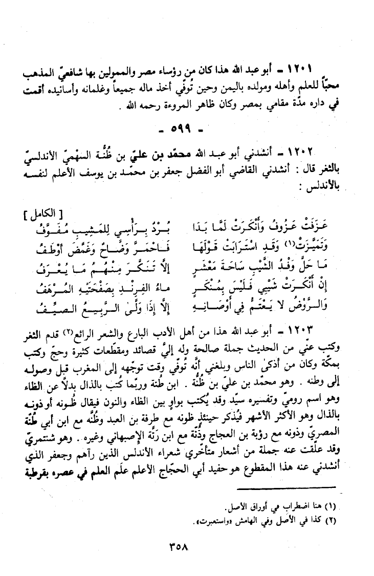 1202 - أَنْشَدَنِي أَبُو عَبْدِ اللَّهِ مُحَمَّدُ بْنُ عَلِيِّ بْنِ ظُنَّةَ السَّهْمِيُّ الْأَنْدَلُسِيُّ بِالثَّغْرِ قَالَ أَنْشَدَنِي الْقَاضِي أَبُو الْفَضْلِ جَعْفَرُ بْنُ مُحَمَّدِ بْنِ يُوسُفَ الْأَعْلَمُ لِنَفْسِهِ بِالْأَنْدَلُسِ