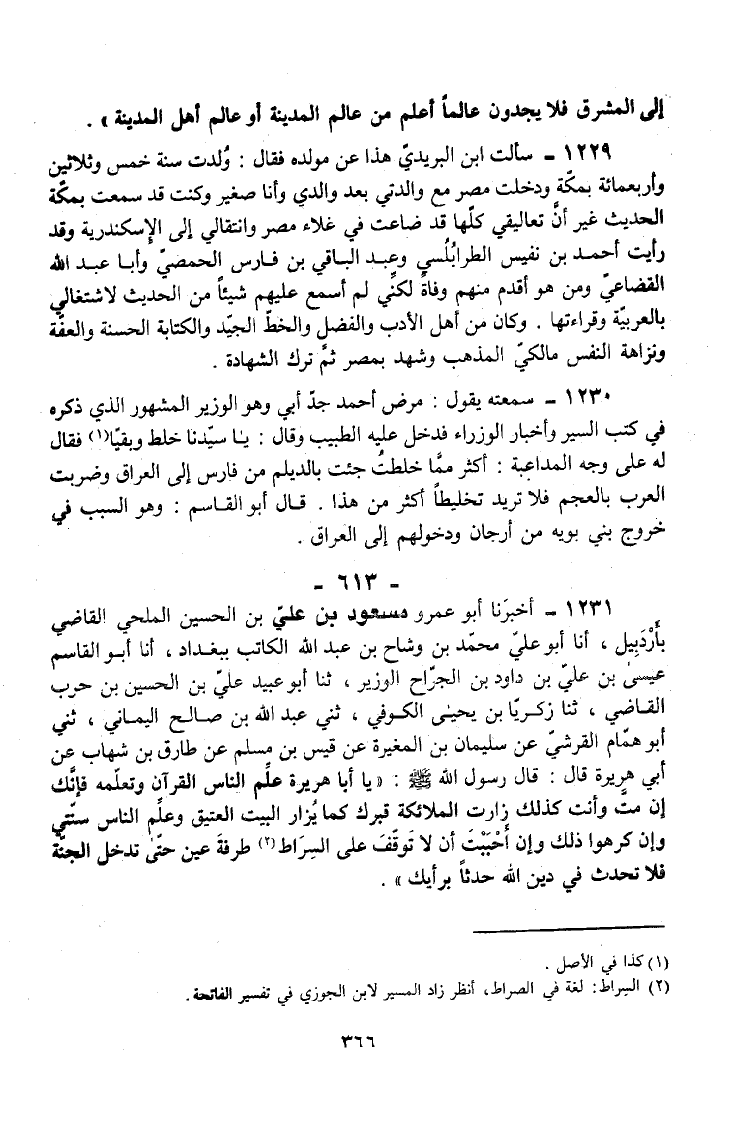 1229 - سَأَلْتُ ابْنَ الْبَرِيدِيِّ هَذَا عَنْ مَوْلِدِهِ فَقَالَ ولدت سنة خمس وَثَلَاثِينَ وَأَرْبَعمِائَة بِمَكَّةَ وَدَخَلْتُ مِصْرَ مَعَ وَالِدَتِي بَعْدَ وَالِدِي وَأَنَا صَغِيرٌ وَكُنْتُ قَدْ سَمِعت بِمَكَّةَ الْحَدِيثَ غَيْرَ أَنَّ تَعَالِيقِي كُلَّهَا قَدْ ضَاعَتْ فِي غَلَاءِ مِصْرَ وَانْتِقَالِي إِلَى الْإِسْكَنْدَرِيَّةِ وَقَدْ رَأَيْتُ أَحْمَدَ بْنَ نَفِيسٍ الطَّرَابُلُسِيَّ وَعَبْدَ الْبَاقِي بْنَ فَارِسٍ الْحِمْصِيَّ وَأَبَا عَبْدِ اللَّهِ الْقُضَاعِيَّ وَمَنْ هُوَ أَقْدَمُ مِنْهُمْ وَفَاةً لَكِنِّي لَمْ أَسْمَعْ عَلَيْهِمْ شَيْئًا مِنَ الْحَدِيثِ لِاشْتِغَالِي بِالْعَرَبِيَّةِ وَقِرَاءَتِهَا