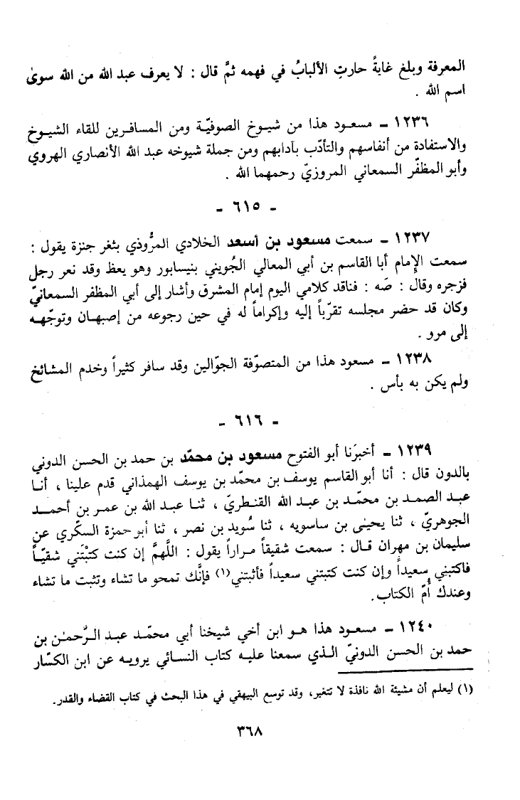 1236 - مَسْعُودٌ هَذَا مِنْ شُيُوخِ الصُّوفِيَّةِ وَمِنَ الْمُسَافِرِينَ لِلِقَاءِ الشُّيُوخِ وَالاسْتِفَادَةِ مِنْ أَنْفَاسِهِمْ وَالتَّأَدُّبِ بِآدَابِهِمْ وَمِنْ جُمْلَةِ شُيُوخِهِ عَبْدُ اللَّهِ الْأَنْصَارِيُّ الْهَرَوِيُّ وَأَبُو الْمُظَفَّرِ السَّمْعَانِيُّ الْمَرْوَزِيُّ رَحِمَهُمَا اللَّهُ