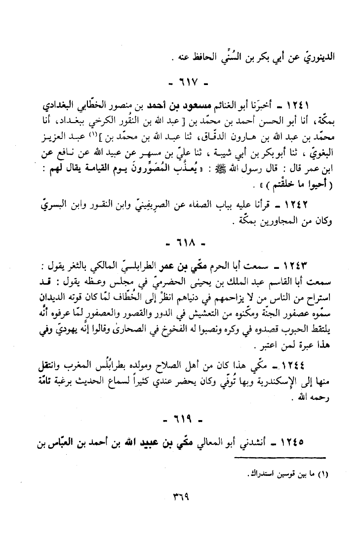 1241 - أَخْبَرَنَا أَبُو الْغَنَائِمِ مَسْعُودُ بْنُ أَحْمَدَ بْنِ مَنْصُورٍ الْخَطَّابِيُّ الْبَغْدَادِيُّ بِمَكَّةَ أَنَا أَبُو الْحَسَنِ أَحْمَدُ بْنُ مُحَمَّدِ بْنِ عَبْدِ اللَّهِ بْنِ النَّقُّورِ الْكَرْخِيُّ بِبَغْدَادَ أَنَا مُحَمَّدُ بْنُ عَبْدِ اللَّهِ بْنِ هَارُونَ الدَّقَّاقُ ثَنَا عَبْدُ اللَّهِ بْنُ مُحَمَّدِ بْنِ عَبْدِ الْعَزِيزِ الْبَغَوِيُّ ثَنَا أَبُو بَكْرِ بْنُ أَبِي شَيْبَةَ ثَنَا عَلِيُّ بْنُ مُسْهِرٍ عَنْ عُبَيْدِ اللَّهِ عَنْ نَافِعٍ عَنِ ابْنِ عُمَرَ قَالَ قَالَ رَسُولُ اللَّهِ صَلَّى اللَّهُ عَلَيْهِ وَسَلَّمَ يُعَذَّبُ الْمُصَوِّرُونَ يَوْمَ الْقِيَامَةِ يُقَالُ لَهُمْ أَحْيُوا مَا خَلَقْتُمْ