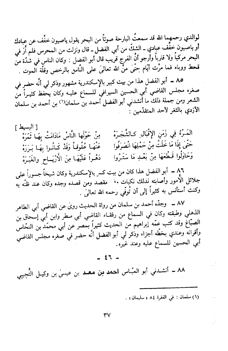 85 - أَبُو الْفَضْلِ هَذَا مِنْ بَيْتٍ كَبِيرٍ بِالْإِسْكَنْدَرِيَّةِ مَشْهُورٍ وَذَكَرَ لِي أَنَّهُ حَضَرَ فِي صِغَرِهِ مَجْلِسَ الْقَاضِي أَبِي الْحُسَيْنِ السِّيرَافِيِّ لِلسَّمَاعِ عَلَيْهِ وَكَانَ يَحْفَظُ كَثِيرًا مِنَ الشِّعْرِ وَمِنْ جُمْلَةِ ذَلِكَ مَا أَنْشَدَنِي أَبُو الْفَضْلِ أَحْمَدُ بْنُ سَلْمَانَ بْنِ أَحْمَدَ بْنِ سَلْمَانَ الْأَزْدِيُّ بالثَّغْرِ لِأَحَدِ الْمُتَقَدِّمِينَ
