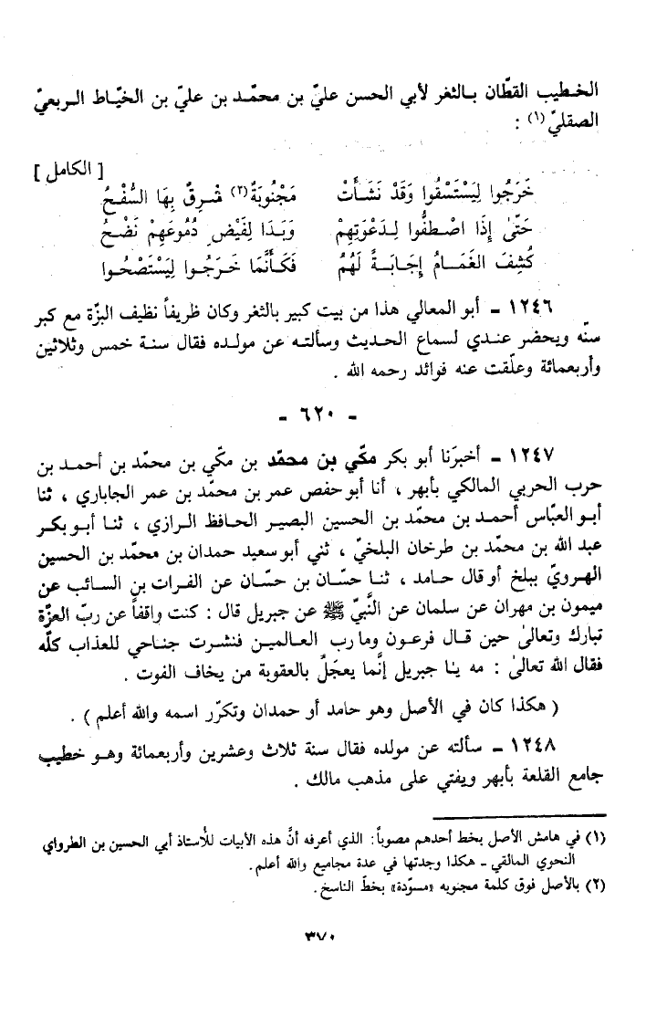 1248 - سَأَلْتُهُ عَنْ مَوْلِدِهِ فَقَالَ سَنَةَ ثَلَاثٍ وَعِشْرِينَ وَأَرْبَعمِائَة وَهُوَ خَطِيبُ جَامِعِ الْقَلْعَةِ بِأَبْهَرَ وَيُفْتِي عَلَى مَذْهَبِ مَالِكٍ