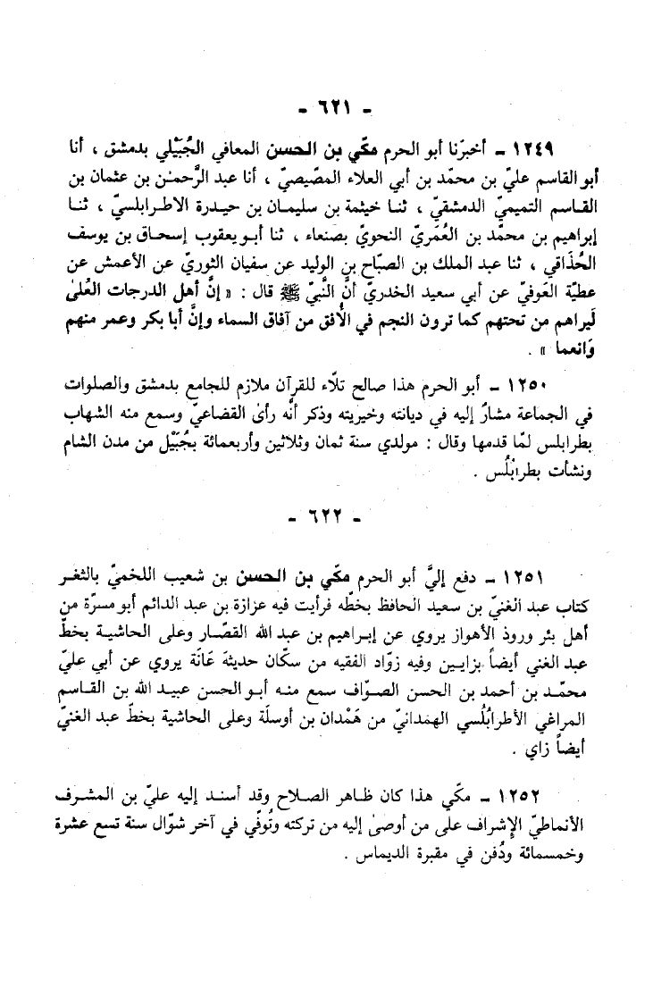 1250 - أَبُو الْحَرَمِ هَذَا صَالِحٌ تَلاءٌ لِلْقُرْآنِ مُلازِمٌ لِلْجَامِعِ بِدِمَشْقَ وَالصَّلَوَاتِ فِي الْجَمَاعَةِ مُشَارٌ إِلَيْهِ فِي دِيَانَتِهِ وَخَيْرِيَّتِهِ وَذَكَرَ أَنَّهُ رَأَى الْقُضَاعِيَّ وَسَمِعَ مِنْهُ الشِّهَابُ بِطَرَابُلُسَ لَمَّا قَدِمَهَا وَقَالَ مولدِي سنة ثَمَان وَثَلَاثِينَ وَأَرْبَعمِائَة بِجُبَيْلٍ مِنْ مُدُنِ الشَّامِ وَنَشَأْتُ بِطَرَابُلُسَ