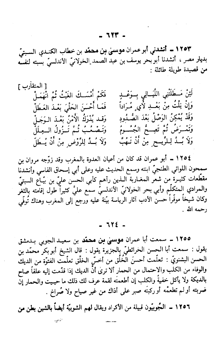 1253 - أَنْشَدَنِي أَبُو عِمْرَانَ مُوسَى بْنُ مُحَمَّدِ بْنِ خَطَّابٍ الْكِنْدِيُّ السَّبْتِيُّ بِدِيَارِ مِصْرَ أَنْشَدَنَا أَبُو بَحْرٍ يُوسُفُ بْنُ عَبْدِ الصَّمَدِ الْخَوْلَانِيُّ الْأَنْدَلُسِيُّ بِسَبْتَةَ لِنَفْسِهِ مِنْ قَصِيدَةٍ طَوِيلَةٍ طَائِلَةٍ