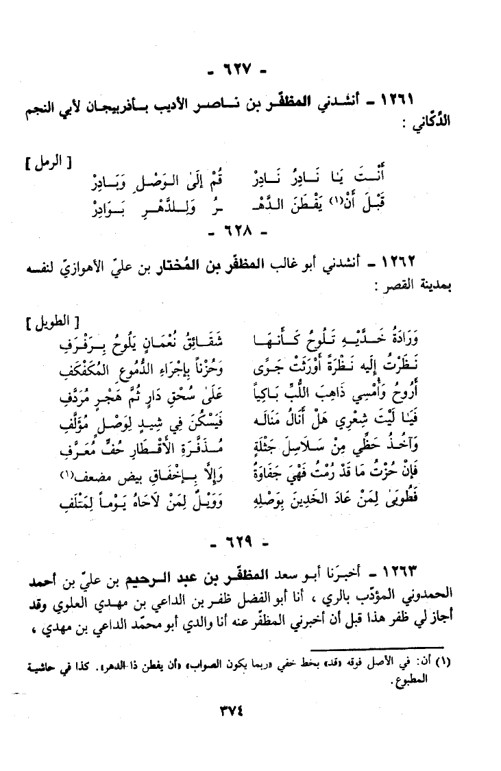 1261 - أَنْشَدَنِي الْمُظَفَّرُ بْنُ نَاصِرٍ الْأَدِيبُ بِأَذْرَبِيجَانَ لِأَبِي النَّجْمِ الدُّكَّانِيِّ