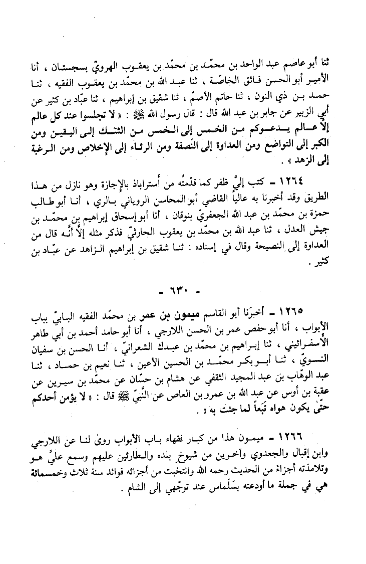 1264 - كَتَبَ إِلَيَّ ظَفَرٌ كَمَا قَدَّمْتُهُ مِنْ أَسْتَرَابَاذَ بِالْإِجَازَةِ وَهُوَ نَازِلٌ مِنْ هَذَا الطَّرِيقِ وَقَدْ أَخْبَرَنَا بِهِ عَالِيًا الْقَاضِي أَبُو الْمَحَاسِنِ الرُّويَانِيُّ بِالرَّيِّ أَنَا أَبُو طَالِبٍ حَمْزَةُ بْنُ مُحَمَّدِ بْنِ عَبْدِ اللَّهِ الْجَعْفَرِيُّ بِنَوْقَانَ أَنَا أَبُو إِسْحَاقَ إِبْرَاهِيمُ بْنُ مُحَمَّدٍ بْنِ جَيْشِ الْعَدْلُ ثَنَا عَبْدُ اللَّهِ بْنُ مُحَمَّدِ بْنِ يَعْقُوبَ الْحَارِثِيُّ فَذَكَرَ مِثْلَهُ إِلَّا أَنَّهُ قَالَ مِنَ الْعَدَاوَةِ إِلَى النَّصِيحَةِ وَقَالَ فِي إِسْنَادِهِ ثَنَا شَقِيقُ بْنُ إِبْرَاهِيمَ الزَّاهِدُ عَنْ عَبَّادِ بْنِ كَثِيرٍ