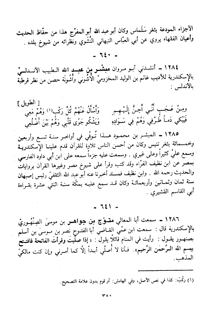 1284 - أَنْشَدَنِي أَبُو مُرْوَانَ مُبَشِّرُ بْنُ عَبْدِ اللَّهِ الطَّبِيبُ الْأَنْدَلُسِيُّ بِالْإِسْكَنْدَرِيَّةِ لِلأَدِيبِ غَانِمِ بْنِ الْوَلِيدِ الْمَخْزُومِيِّ الْأُشُونِيِّ وَأُشُونَةُ حِصْنٌ مِنْ نُظُرِ قُرْطُبَةَ بِالْأَنْدَلُسِ