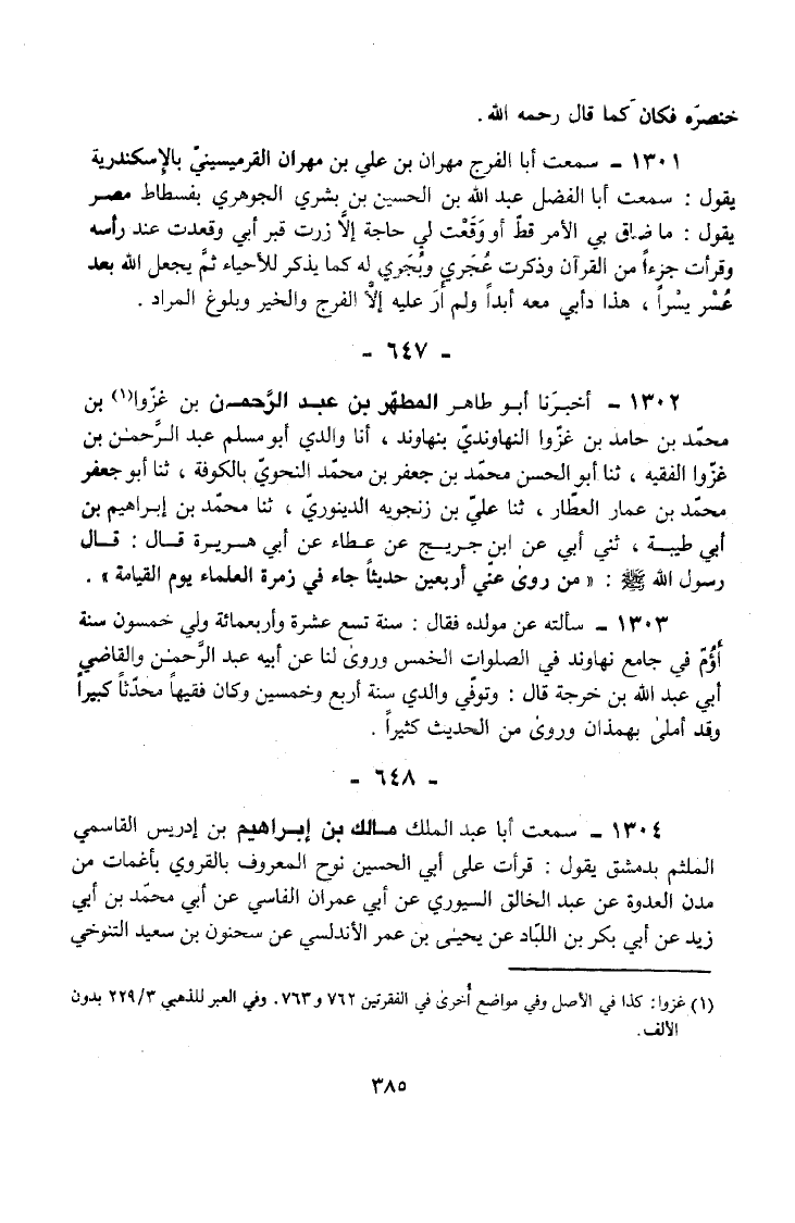 1303 - سَأَلْتُهُ عَنْ مَوْلِدِهِ فَقَالَ سَنَةَ تِسْعٍ عشرَة وَأَرْبَعمِائَة وَلِي خَمْسُونَ سَنَةً أَؤُمُّ فِي جَامِعِ نُهَاوَنْدَ فِي الصَّلَوَاتِ الْخَمْسِ وَرَوَى لَنَا عَنْ أَبِيهِ عَبْدِ الرَّحْمَنِ وَالْقَاضِي أَبِي عَبْدِ اللَّهِ بْنِ خَرْجَةَ قَالَ وَتُوُفِّيَ وَالِدِي سَنَةَ أَرْبَعٍ وَخَمْسِينَ وَكَانَ فَقِيهًا مُحَدِّثًا كَبِيرًا وَقَدْ أَمْلَى بِهَمَذَانَ وَرَوَى مِنَ الْحَدِيثِ كَثِيرًا.