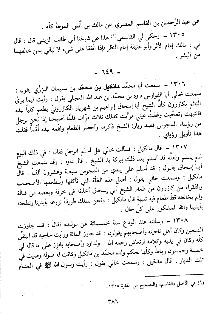 1307 - قَالَ مَانَكِيلُ فَسَأَلْتُ خَالِي هَلْ أَسْلَمَ الرَّجُلُ فَقَالَ فِي ذَلِكَ الْيَوْمِ لَمْ يُسْلِمْ وَلَعَلَّهُ قَدْ أَسْلَمَ بَعْدَ ذَلِك ببركة يَد الشَّيْخِ.