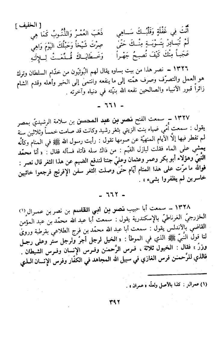 1328 - سَمِعت أَبَا حَبِيبٍ نَصْرَ بْنَ أَبِي الْقَاسِمِ بْنِ نَصْرِ بْنِ عُمْرَالٍ الْخَزْرَجِيَّ الْغَرْنَاطِيَّ بِالْإِسْكَنْدَرِيَّةِ يَقُولُ سَمِعْتُ أَبَا عَبْدِ اللَّهِ مُحَمَّدَ بْنَ عَبْدِ الْمُؤْمِنِ الْقَاضِيَ بِالْأَنْدَلُسِ يَقُولُ سَمِعت أَبَا عَبْدِ اللَّهِ مُحَمَّدَ بْنَ فَرَجٍ الطَّلَاعِيَّ بِقُرْطُبَةَ وَرَوَى لَنَا قَوْلَ النَّبِيِّ صَلَّى اللَّهُ عَلَيْهِ وَسَلَّمَ الَّذِي فِي الْمُوَطَّأِ الْخَيْلُ لِرَجُلٍ أَجْرٌ وَلِرَجُلٍ سِتْرٌ وَعَلَى رَجُلٍ وِزْرٌ فَقَالَ الْخُيُولُ ثَلَاثَةٌ فَرَسُ الرَّحْمَنِ وَفَرَسُ الْإِنْسَانِ وَفَرَسُ الشَّيْطَانِ.