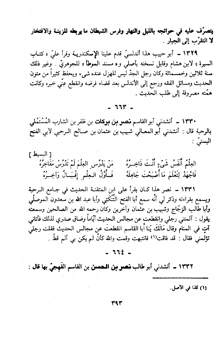 1330 - أَنْشَدَنِي أَبُو الْقَاسِمِ نَصْرُ بْنُ بَرَكَاتِ بْنِ ظَفْرِ بْنِ الشَّارِبِ الْمُسْتَمْلِي بِالرَّحْبَةِ قَالَ أَنْشَدَنِي أَبُو الْمَعَالِي شَبِيبُ بْنُ عُثْمَانَ بْنِ صَالِحٍ الرَّحْبِيُّ لِأَبِي الْفَتْحِ الْبُسْتِيُّ
