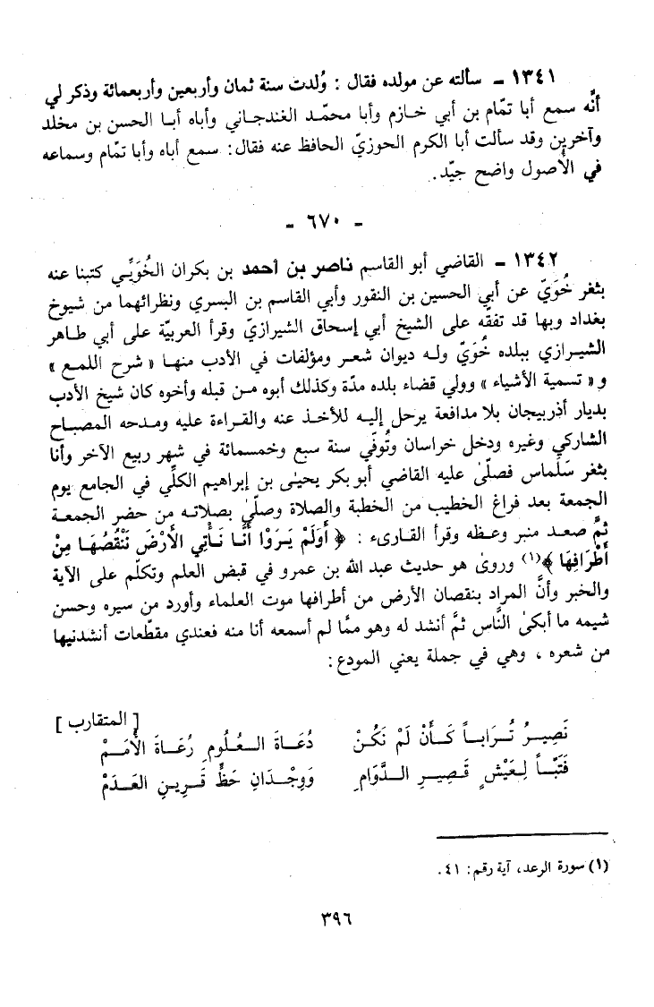 1342 - الْقَاضِي أَبُو الْقَاسِمِ نَاصِرُ بْنُ أَحْمَدَ بْنِ بَكْرَانَ الْخُوَيِّيُّ كَتَبْنَا عَنْهُ بِثَغْرِ خُوَيَّ عَنْ أَبِي الْحُسَيْنِ بْنِ النَّقٌّورِ وَأَبِي الْقَاسِمِ بْنِ الْبُسْرِيِّ وَنُظَرَائِهِمَا مِنْ شُيُوخِ بَغْدَادَ وَبِهَا قَدْ تَفَقَّهَ عَلَى الشَّيْخِ أَبِي إِسْحَاقَ الشِّيرَازِيِّ وَقَرَأَ الْعَرَبِيَّةَ عَلَى أَبِي طَاهِرٍ الشِّيرَازِيِّ بِبَلَدِهِ خُوَيَّ وَلَهُ دِيوَانُ شِعْرٍ وَمُؤَلَّفَاتٌ فِي الْأَدَبِ مِنْهَا شَرْحُ اللُّمَعِ وَتَسْمِيَةُ الْأَشْيَاءِ وَوَلِيَ قَضَاءَ بَلَدِهِ مُدَّةً وَكَذَلِكَ أَبُوهُ مِنْ قَبْلِهِ وَأَخُوهُ كَانَ شَيْخَ الْأَدَبِ بِدِيَارِ أَذْرَبِيجَانَ بِلَا مُدَافَعَةٍ يُرْحَلُ إِلَيْهِ لِلْأَخْذِ عَنْهُ وَالْقِرَاءَةِ عَلَيْهِ وَمَدَحَهُ الْمِصْبَاحُ الشَّارِكِيُّ وَغَيْرُهُ وَدَخَلَ خُرَاسَان وَتُوفِّي سنة سبع وَخَمْسمِائة فِي شَهْرِ رَبِيعٍ الْآخِرِ وَأَنَا بِثْغَرِ سَلَمَاسَ فَصَلَّى عَلَيْهِ الْقَاضِي أَبُو بَكْرٍ يَحْيَى بْنُ إِبْرَاهِيمَ الْكِلِّيُّ فِي الْجَامِعِ يَوْمَ الْجُمُعَةِ بَعْدَ فَرَاغِ الْخَطِيبِ مِنَ الْخُطْبَةِ وَالصَّلَاةِ وَصَلَّى بِصَلَاتِهِ مَنْ حَضَرَ الْجُمُعَةَ ثُمَّ صَعَدَ مِنْبَرَ وَعْظِهِ وَقَرَأَ الْقَارئ {أَو لم يَرَوْا أَنَّا نَأْتِي الأَرْضَ نَنْقُصُهَا من أطرافها} وَرَوَى هُوَ حَدِيثَ عَبْدِ اللَّهِ بْنِ عَمْرٍو فِي قَبْضِ الْعِلْمِ وَتَكَلَّمَ عَلَى الْآيَةِ وَالْخَبَرِ وَأَنَّ الْمُرَادَ بِنُقْصَانِ الْأَرْضِ مِنْ أَطْرَافِهَا مَوْتُ الْعُلَمَاءِ وَأَوْرَدَ مِنْ سِيَرِهِ وَحُسْنِ شِيَمِهِ مَا أَبْكَى النَّاسَ ثُمَّ أَنْشَدَ لَهُ وَهُوَ مِمَّا لَمْ أَسْمَعْهُ أَنَا مِنْهُ فَعِنْدِي مُقَطَّعَاتٌ أَنْشَدَنِيهَا مِنْ شِعْرِهِ وَهِيَ فِي جُمْلَةٍ يَعْنِي الْمُودَعَ