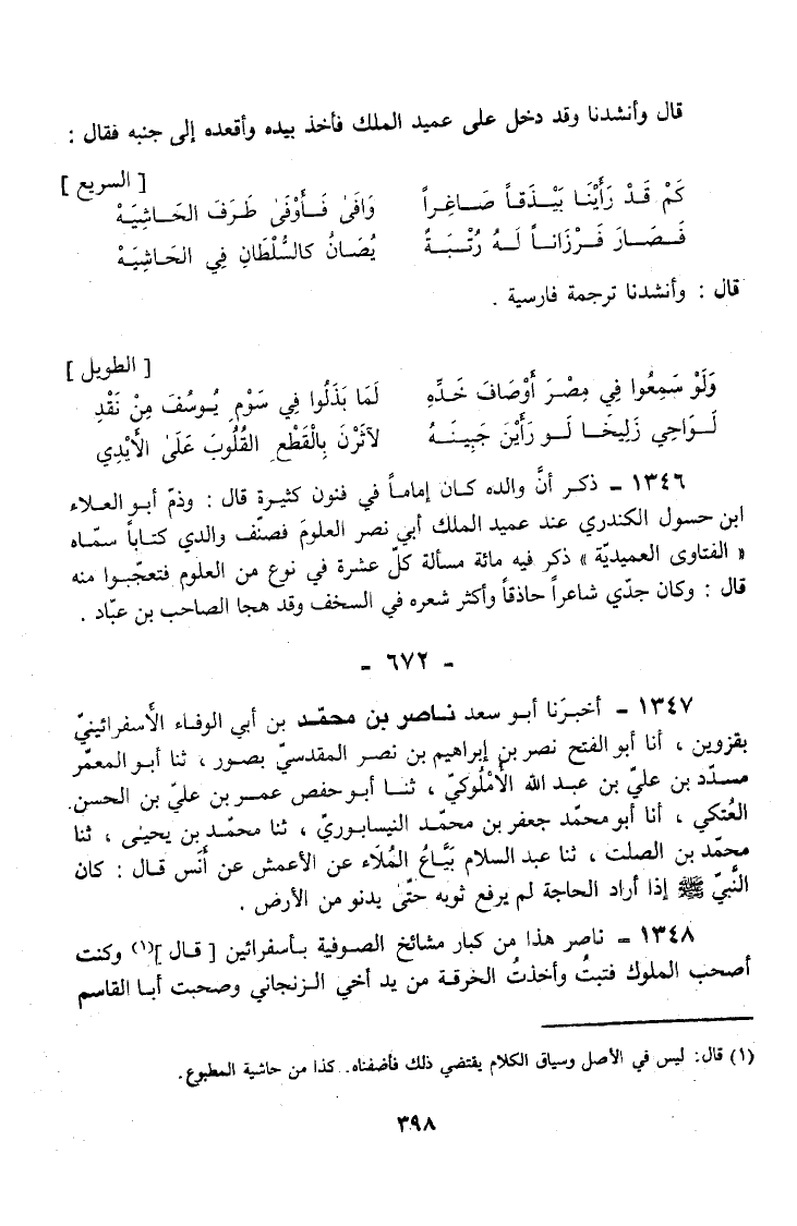 1346 - ذَكَرَ أَنَّ وَالِدَهُ كَانَ إِمَامًا فِي فُنُونٍ كَثِيرَةٍ قَالَ وَذَمَّ أَبُو الْعَلَاء ابْن حُسُولٍ الْكَنْدَرِيُّ عِنْدَ عُمَيْدٍ الْمَلِكِ أَبِي نَصْرٍ الْعُلُومَ فَصَنَّفَ وَالِدِي كِتَابًا سَمَّاهُ الْفَتَاوَى الْعُمَيْدِيَّةَ ذَكَرَ فِيهِ مِائَةَ مَسْأَلَةٍ كُلُّ عَشَرَةٍ فِي نَوْعٍ مِنَ الْعُلُومِ فَتَعَجَّبُوا مِنْهُ قَالَ وَكَانَ جَدِّي شَاعِرًا حَاذِقًا وَأَكْثَرُ شِعْرِهِ فِي السَّخَفِ وَقَدْ هَجَا الصَّاحِبَ بْنَ عَبَّادٍ