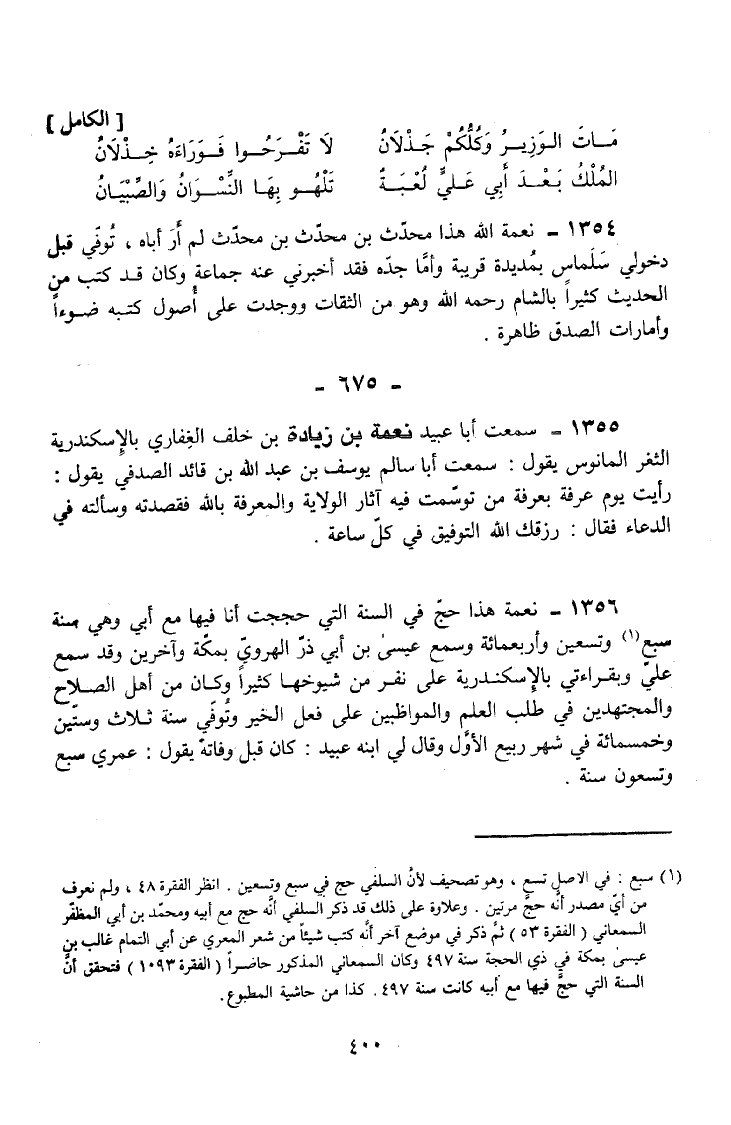 1356 - نِعْمَةُ هَذَا حَجَّ فِي السَّنَةِ الَّتِي حَجَجْتُ أَنَا فِيهَا مَعَ أَبِي وَهِي سنة سبع وَتِسْعين وَأَرْبَعمِائَة وَسَمِعَ عِيسَى بْنَ أَبِي ذَرٍّ الْهَرَوِيَّ بِمَكَّةَ وَآخَرِينَ وَقَدْ سَمِعَ عَلَيَّ وَبِقَرَاءَتِي بِالْإِسْكَنْدَرِيَّةِ عَلَى نَفَرٍ مِنْ شُيُوخِهَا كَثِيرًا وَكَانَ مِنْ أَهْلِ الصَّلَاحِ وَالْمُجْتَهِدِينَ فِي طَلَبِ الْعِلْمِ وَالْمُوَاظِبِينَ عَلَى فِعْلِ الْخَيْرِ وَتُوفِّي سنة ثَلَاث وَسِتِّينَ وَخَمْسمِائة فِي شَهْرِ رَبِيعٍ الْأَوَّلِ وَقَالَ لِي ابْنُهُ عُبَيْدٌ كَانَ قَبْلَ وَفَاتِهِ يَقُولُ عُمْرِي سَبْعٌ وَتِسْعُونَ سَنَةً