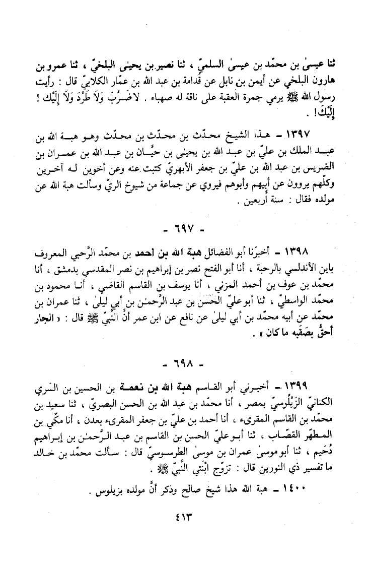 1397 - هَذَا الشَّيْخُ مُحَدِّثُ بْنُ محمدث بْنِ مُحَدِّثٍ وَهُوَ هِبَةُ اللَّهِ بْنُ عَبْدِ الْمَلِكِ بْنِ عَلِيٍّ بْنُ عَبْدِ اللَّهِ بْنِ يَحْيَى بْنِ حَيَّانَ بْنِ عَبْدِ اللَّهِ بْنِ عِمْرَانَ بْنِ الضَّرَيسِ بْنِ عَبْدُ اللَّهِ بْنُ عَلِيِّ بْنِ جَعْفَرٍ الْأَبْهَرِيُّ كَتَبْتُ عَنْهُ وَعَنْ أَخَوَيْنِ لَهُ آخَرَيْنِ وَكُلُّهُمْ يَرْوُونَ عَنْ أَبِيهِمْ وَأَبُوهُمْ فَيَرْوِي عَنْ جَمَاعَةٍ مِنْ شُيُوخِ الرَّيِّ وَسَأَلْتُ هِبَةَ اللَّهِ عَنْ مَوْلِدِهِ فَقَالَ سَنَةَ أَرْبَعِينَ
