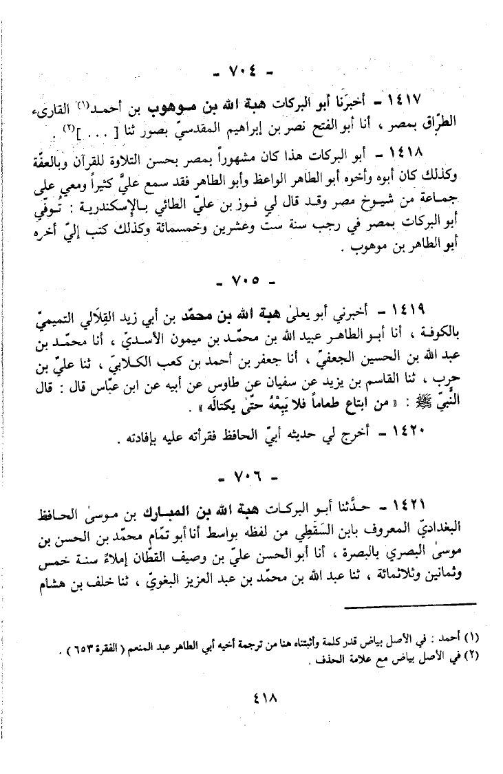 1418 - أَبُو الْبَرَكَاتِ هَذَا كَانَ مَشْهُورًا بِمِصْرَ بِحُسْنِ التِّلَاوَةِ لِلْقُرْآنِ وَبِالْعِفَّةِ وَكَذَلِكَ كَانَ أَبُوهُ وَأَخُوهُ أَبُو الطَّاهِرِ الْوَاعِظُ وَأَبُو الطَّاهِرِ فَقَدْ سَمِعَ عَلَيَّ كَثِيرًا وَمَعِي عَلَى جَمَاعَةٍ مِنْ شُيُوخِ مِصْرَ وَقَدْ قَالَ لِي فَوْزُ بْنُ عَلِيٍّ الطَّائِيُّ بِالْإِسْكَنْدَرِيَّةِ تُوُفِّيَ أَبُو الْبَرَكَاتِ بِمِصْرَ فِي رَجَبٍ سَنَةَ سِتّ وَعشْرين وَخَمْسمِائة وَكَذَلِكَ كَتَبَ إِلَيَّ أَخُوهُ أَبُو الطَّاهِرِ بْنُ مَوْهُوبٍ