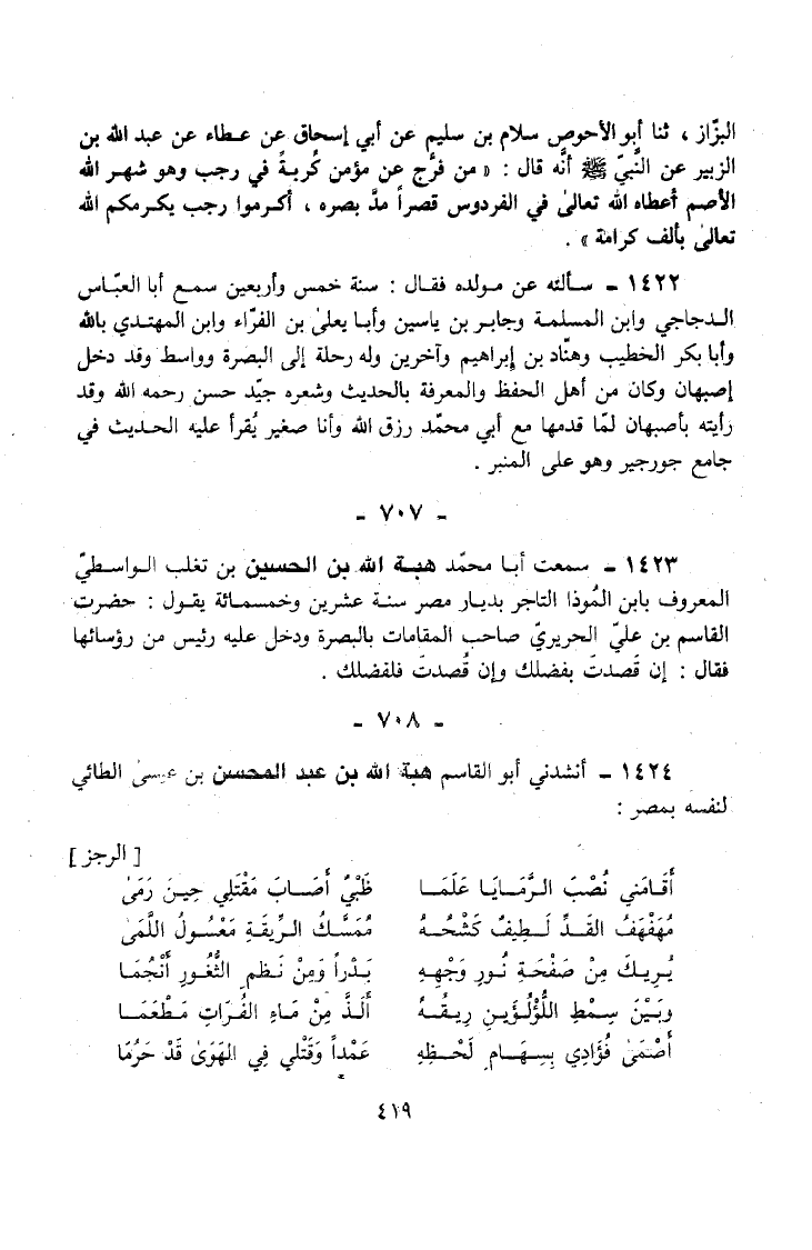 1423 - سَمِعت أَبَا مُحَمَّدٍ هِبَةَ اللَّهِ بْنَ الْحُسَيْنِ بْنِ تَغْلِبَ الْوَاسِطِيَّ الْمَعْرَوفَ بِابْنِ الْمُوَذَا التَّاجِرَ بِدِيَارِ مصر سنة عشْرين وَخَمْسمِائة يَقُولُ حَضَرْتُ الْقَاسِمَ بْنَ عَلِيٍّ الْحَرِيرِيّ صَاحِبَ الْمَقَامَاتِ بِالْبَصْرَةِ وَدَخَلَ عَلَيْهِ رَئِيسٌ مِنْ رُؤَسَائِهَا فَقَالَ إِنْ قَصَدْتَ بِفَضْلِكَ وَإِنْ قُصِدْتَ فَلِفَضْلِكَ