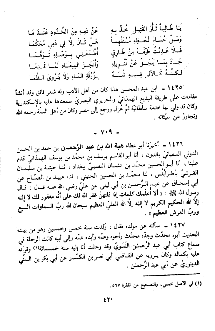 1427 - سَأَلْتُهُ عَنْ مَوْلِدِهِ فَقَالَ وُلِدْتُ سَنَةَ خَمْسٍ وَخَمْسِينَ وَهُوَ مِنْ بَيْتِ الْحَدِيثِ أَبُوهُ مُحَدِّثٌ وَجَدُّهُ مُحَدِّثٌ وَأَخُوهُ وَعَمُّهُ وَأَبْنَاءُ عَمِّهِ وَإِلَى أَبِيهِ كَانَتِ الرِّحْلَةُ فِي سَمَاعِ كِتَابِ أَبِي عَبْدِ الرَّحْمَنِ النَّسَوِيِّ وَقَدْ رَحَلْتُ أَنَا إِلَيْهِ سَنَةَ خَمْسمِائَة وَقَرَأْتُهُ عَلَيْهِ بِكَمَالِهِ وَكَانَ يَرْوِيهِ عَنِ الْقَاضِي أَبِي نَصْرِ بْنِ الْكَسَّارِ عَنْ أَبِي بَكْرِ بْنِ السُّنِّيِّ الدَّيْنَوَرِيِّ عَنْ أَبِي عَبْدِ الرَّحْمَنِ