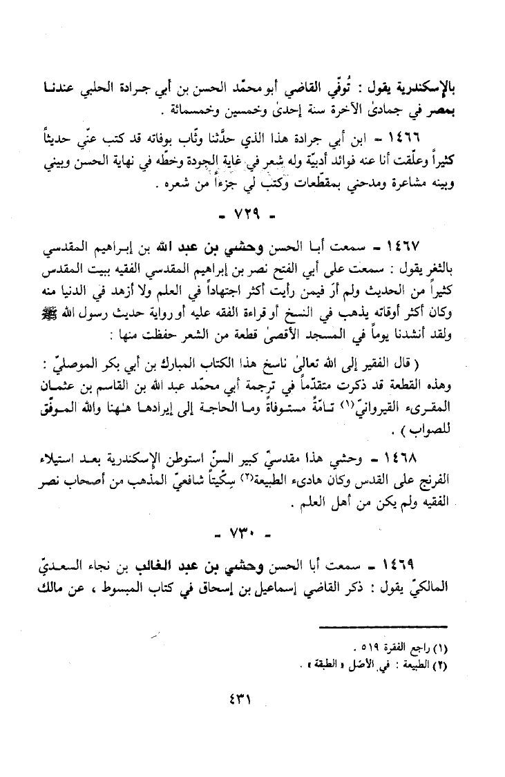 1469 - سَمِعت أَبَا الْحَسَنِ وَحْشِيَّ بْنَ عَبْدِ الْغَالِبِ بْنِ نَجَاءٍ السَّعْدِيَّ الْمَالِكِيَّ يَقُولُ ذَكَرَ الْقَاضِي إِسْمَاعِيلُ بْنُ إِسْحَاقَ فِي كِتَابِ الْمَبْسُوطِ عَنْ مَالِكٍ