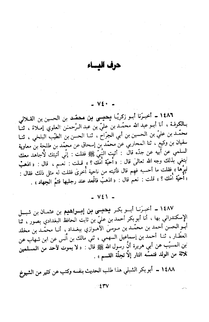 1486 - أخبرنَا أَبُو زَكَرِيَّا يَحْيَى بْنُ مُحَمَّدِ بْنِ الْحُسَيْنِ بْنِ الْقِلَالِيِّ بِالْكُوفَةِ أَنَا أَبُو عَبْدِ اللَّهِ مُحَمَّدَ بْنَ عَلِيِّ بن بْنِ عَبْدِ الرَّحْمَنِ الْعَلَوِيُّ إِمْلَاءً ثَنَا مُحَمَّدُ بْنُ عَلِيِّ بْنِ الْحُسَيْنِ بْنِ أَبِي الْجَرَّاحِ ثَنَا الْحسن بن الطّيب الْبَلْخِي ثَنَا سُفْيَانُ بْنُ وَكِيعٍ ثَنَا الْمُحَارِبِيُّ عَنْ مُحَمَّدِ بْنِ إِسْحَاقَ عَن مُحَمَّد بن طَلْحَة بن مُعَاوِيَةَ السَّلْمِيِّ عَنْ أَبِيهِ عَنْ جَدِّهِ قَالَ أَتَيْتُ النَّبِيَّ صَلَّى اللَّهُ عَلَيْهِ وَسَلَّمَ فَقُلْتُ إِنِّي أَتَيْتُكَ لِأُجَاهِدَ مَعَكَ أَبْتَغِي بِذَلِكَ وَجْهَ اللَّهِ تَعَالَى قَالَ أَحَيَّةٌ أُمُّكَ قُلْتُ نَعَمْ قَالَ اذْهَبْ فَبِرَّهَا فَقُلْتُ مَا أَحْسَبُهُ فَهِمَ قَالَ فَأَتَيْتُهُ مِنْ نَاحِيَةٍ أُخْرَى فَقُلْتُ لَهُ مِثْلَ ذَلِكَ فَقَالَ أَحَيَّةٌ أُمُّكَ قُلْتُ نَعَمْ قَالَ اذْهَبْ فَاقْعُدْ عِنْدَ رِجْلَيْهَا فَثَمَّ الْجِهَادُ