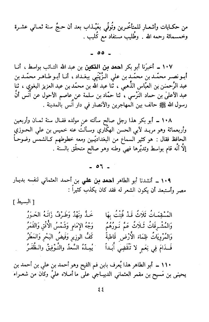 109 - أَنْشَدَنَا أَبُو الطَّاهِرِ أَحْمَدُ بْنُ عَلِيِّ بْنِ أَحْمَدَ الْعُثْمَانِيُّ لِنَفْسِهِ بِدِيَارِ مِصْرَ وَأَسْتَبْعِدُ أَنْ يَكُونَ الشِّعْرُ لَهُ فَقَدْ كَانَ يَكْذِبُ كَثِيرًا