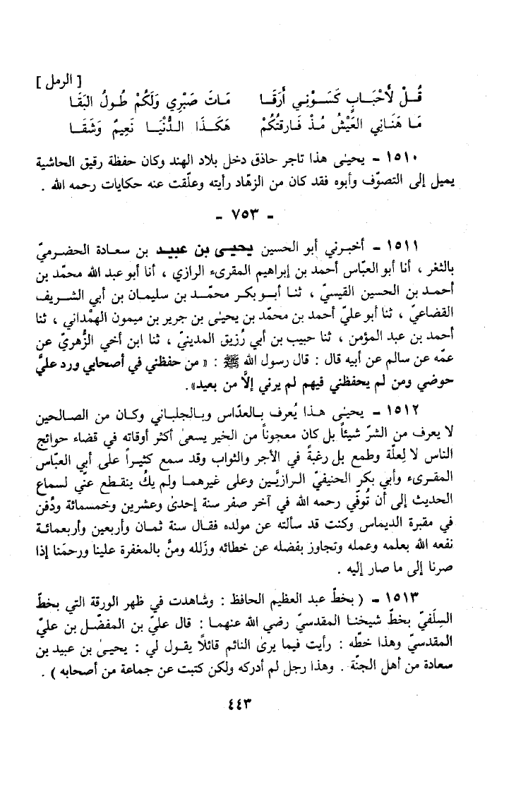 1510 - يَحْيَى هَذَا تَاجِرٌ حَاذِقٌ دَخَلَ بِلَادَ الْهِنْدِ وَكَانَ حَفِظَةً رَقِيقَ الْحَاشِيَةِ يَمِيلُ إِلَى التَّصَوُّفِ وَأَبُوهُ فَقَدْ كَانَ مِنَ الزُّهَّادِ رَأَيْتُهُ وَعَلَّقْتُ عَنْهُ حِكَايَاتٍ رَحِمَهُ اللَّهُ