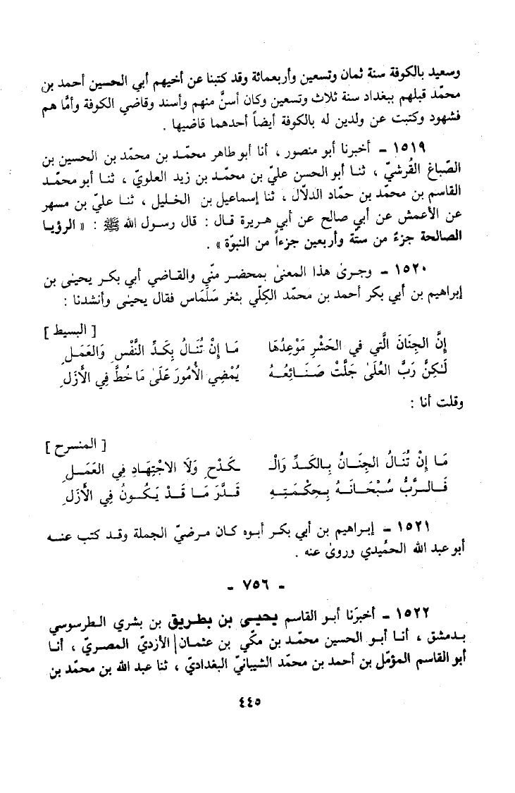 1522 - أخبرنَا أَبُو الْقَاسِمِ يَحْيَى بْنُ بِطْرِيقَ بْنِ بِشْرِيٍّ الطَّرَسُوسِيُّ بِدِمَشْقَ أَنَا أَبُو الْحُسَيْنِ مُحَمَّدُ بْنُ مَكِّيِّ بْنِ عُثْمَانَ الْأَزْدِيُّ الْمِصْرِيُّ أَنَا أَبُو الْقَاسِمِ الْمُؤَمَّلُ بْنُ أَحْمَدَ بْنِ مُحَمَّدٍ الشَّيْبَانِيُّ الْبَغْدَادِيُّ ثَنَا عَبْدُ اللَّهِ بْنُ مُحَمَّدِ بْنِ