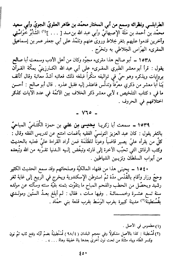 1538 - أَبُو صَالِحٍ هَذَا مُقْرِئٌ مُجَوِّدٌ وَكَانَ مِنْ أَهْلِ الأَدَبِ وَسمعت أَبَا صَالِحٍ يَقُولُ قَرَأَ أَبُو مَعْشَرٍ الطَّبَرِيُّ الْمُقْرِئُ عَلَى أَبِي عَبْدِ اللَّهِ الْكَارَزِينِيِّ بِمَكَّةَ الْقُرْآنَ بِرِوَايَاتٍ وَيَذْكُرُهُ وَهُوَ حَيٌّ فِي تواليفه مُنْكرا فلبغه ذَلِكَ فَعَاتَبَهُ أَشَدَّ مُعَاتَبَةٍ وَقَالَ أَتَأْنَفُ يَا أَبَا مَعْشَرٍ مِنْ ذِكْرِي مُعَرَّفًا وَتُدَلِّسُ فَاعْتَذَرَ إِلَيْهِ فَقَبِلَ عُذْرَهُ