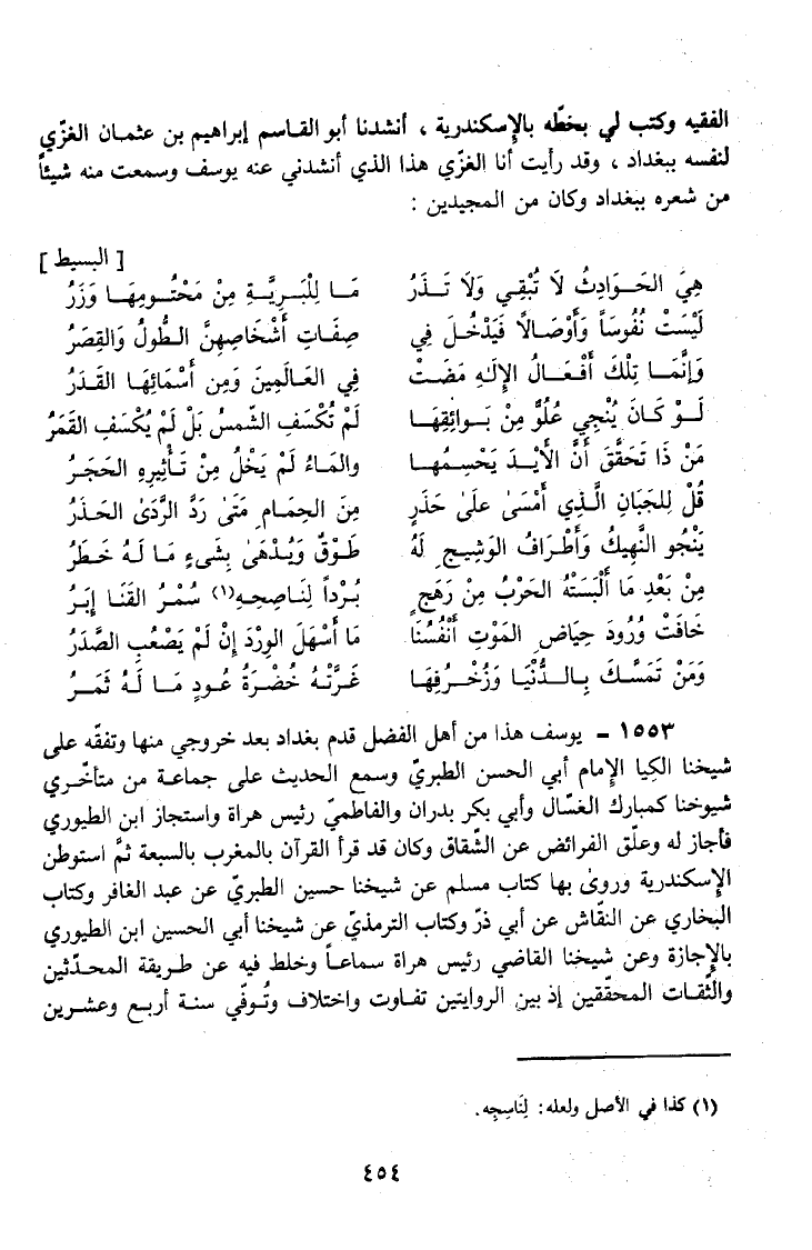 الْفَقِيهُ وَكَتَبَ لِي بِخَطِّهِ بِالإِسْكَنْدَرِيَّةِ أَنْشَدَنَا أَبُو الْقَاسِمِ إِبْرَاهِيمُ بْنُ عُثْمَانَ الْغُزِّيُّ لِنَفْسِهِ بِبَغْدَادَ وَقَدْ رَأَيْتُ أَنَا الْغُزِّيَّ هَذَا الَّذِي أَنْشَدَنِي عَنْهُ يُوسُفُ وَسمعت مِنْهُ شَيْئًا مِنْ شِعْرِهِ بِبَغْدَادَ وَكَانَ مِنَ الْمُجِيدِينَ