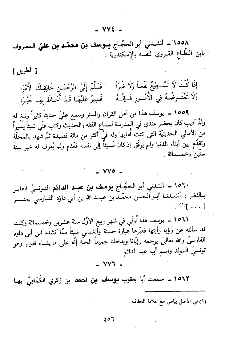 1561 - يُوسُفُ هَذَا تُوُفِّيَ فِي شَهْرِ رَبِيعٍ الْأَوَّلِ سَنَةَ عِشْرِينَ وَخَمْسِمِائَةٍ وَكُنْتُ قَدْ سَأَلْتُهُ عَنْ رُؤْيَا رَأَيْتُهَا فَعَبَّرَهَا عِبَارَةً حَسَنَةً وَأَنْشَدَنِي شَيْئًا مِمَّا أَنْشَدَهُ ابْنُ أَبِي دَاوُدَ الْفَارِسِيُّ وَاللَّهُ تَعَالَى يَرْحَمُهُ وَإِيَّانَا وَيُدْخِلَنَا جَمِيعًا الْجَنَّةَ إِنَّهُ عَلَى مَا يَشَاءُ قَدِيرٌ وَهُوَ تُونِسِيُّ الْمَوْلِدِ وَاسْمُ أَبِيهِ عَبْدُ الدَّائِمِ