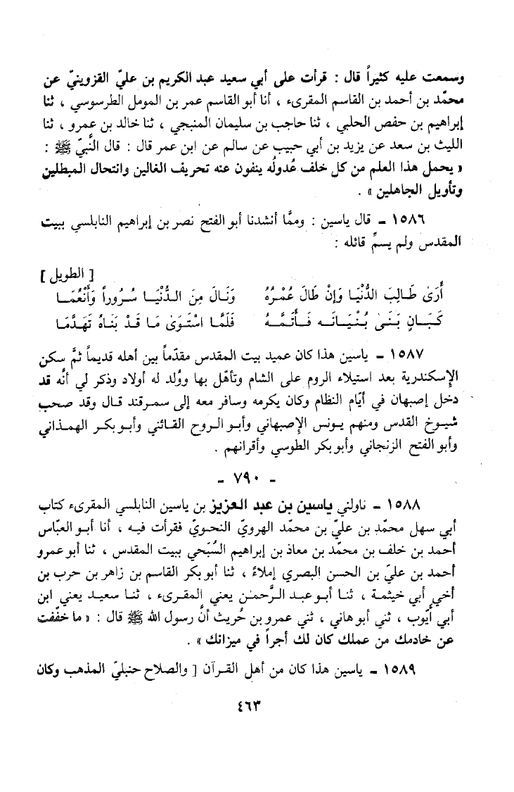 وَسمعت عَلَيْهِ كَثِيرًا قَالَ قَرَأْتُ عَلَى أَبِي سَعِيدٍ عَبْدِ الْكَرِيمِ بْنِ عَلِيٍّ الْقَزْوِينِيِّ عَنْ مَحُمَّدِ بْنِ أَحْمَدَ بْنِ الْقَاسِمِ الْمُقْرِئِ أَنَا أَبُو الْقَاسِمِ عُمَرُ بْنُ المومل الطَّرَسُوسِيُّ ثَنَا إِبْرَاهِيمُ بْنُ حَفْصٍ الْحَلَبِيُّ ثَنَا حَاجِبُ بْنُ سُلَيْمَانَ الْمَنْبِجِيُّ ثَنَا خَالِدُ بْنُ عَمْرٍو ثَنَا اللَّيْثُ بْنُ سَعْدٍ عَنِ يَزِيدَ بْنِ أَبِي حَبِيبٍ عَنْ سَالِمٍ عَنِ ابْنِ عُمَرَ قَالَ قَالَ النَّبِيُّ صَلَّى اللَّهُ عَلَيْهِ وَسَلَّمَ يَحْمِلُ هَذَا الْعِلْمَ مِنْ كُلِّ خَلَفٍ عُدُولُهُ يَنْفُونَ عَنْهُ تَحْرِيفَ الْغَالِينَ وَانْتِحَالَ الْمُبْطِلِينَ وَتَأْوِيلَ الْجَاهِلِينَ