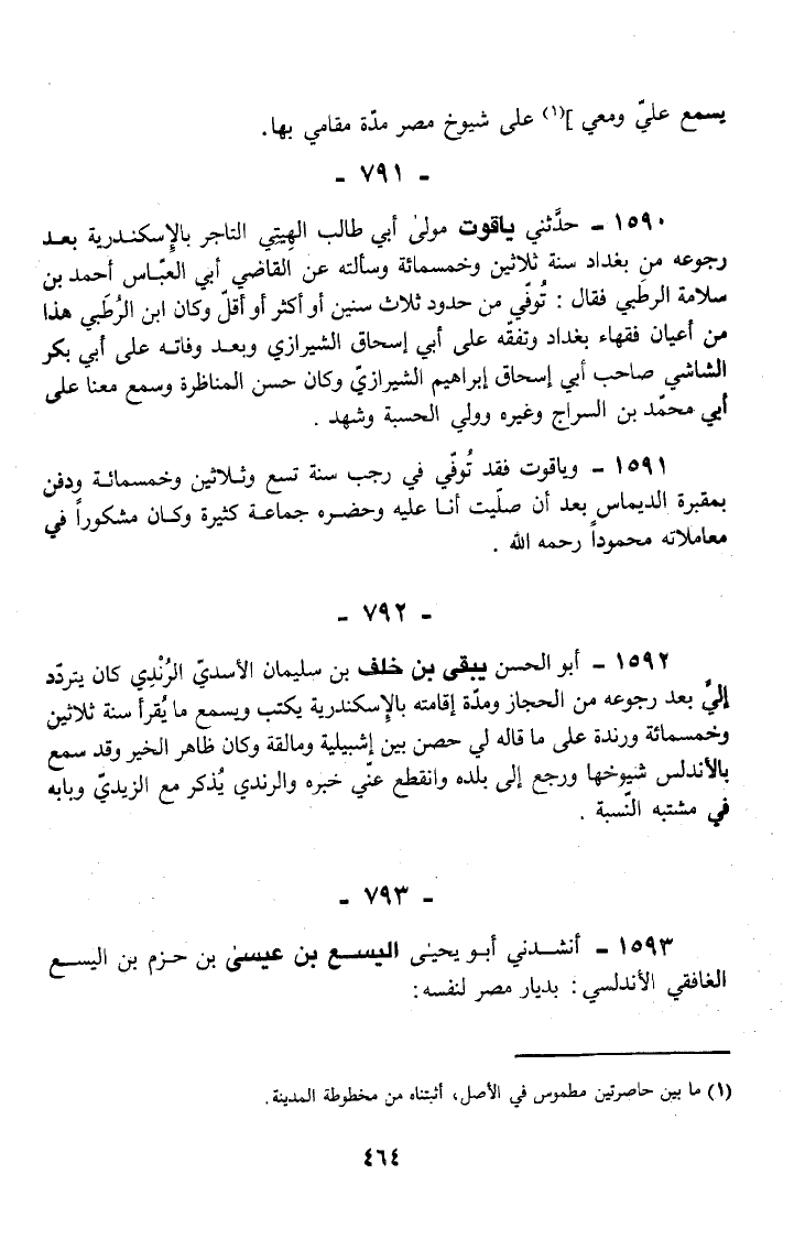 1590 - حَدثنِي يَاقُوتُ مَوْلَى أَبِي طَالِبٍ الْهِيتِيِّ التَّاجِرُ بِالإِسْكَنْدَرِيَّةِ بَعْدَ رُجُوعِهِ مِنْ بَغْدَادَ سَنَةَ ثَلاثِينَ وَخَمْسِمِائَةٍ وَسَأَلْتُهُ عَنِ الْقَاضِي أَبِي الْعَبَّاسِ أَحْمَدَ بْنِ سَلامَةَ الرُّطَبِيِّ فَقَالَ تُوُفِّيَ مِنْ حُدُودِ ثَلاثِ سِنِينَ أَوْ أَكْثَرَ أَوْ أَقَلَّ وَكَانَ ابْنُ الرُّطَبِيِّ هَذَا مِنْ أَعْيَانِ فُقَهَاءِ بَغْدَادَ وَتَفَقَّهَ عَلَى أَبِي إِسْحَاقَ الشِّيرَازِيِّ وَبَعْدَ وَفَاتِهِ عَلَى أَبِي بَكْرٍ الشَّاشِيِّ صَاحِبِ أَبِي إِسْحَاقَ إِبْرَاهِيمَ الشِّيرَازِيِّ وَكَانَ حَسَنَ الْمُنَاظَرَةِ وَسَمِعَ مَعَنَا عَلَى أَبِي مُحَمَّدِ بْنِ السَّرَّاجِ وَغَيْرِهِ وَوَلِيَ الْحِسْبَةَ وَشَهِدَ