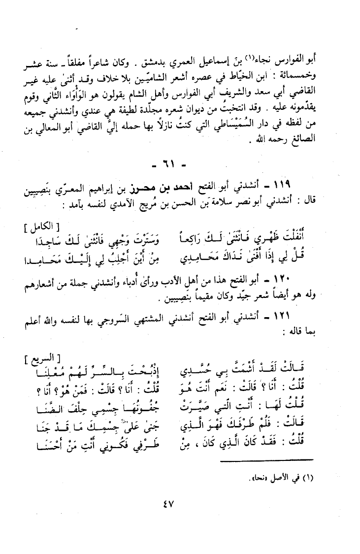 119 - أَنْشَدَنِي أَبُو الْفَتْحِ أَحْمَدُ بْنُ مُحْرِزِ بْنِ إِبْرَاهِيمَ الْمَعَرِّيُّ بِنَصِيبِينَ قَالَ أَنْشَدَنِي أَبُو نَصْرٍ سَلَامَةُ بْنُ الْحَسَنِ بْنِ مُرَيْجٍ الْآمِدِيُّ لِنَفْسِهِ بِآمِدَ