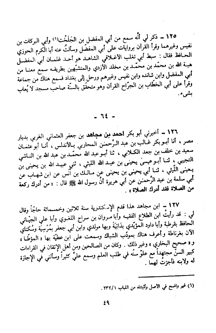 125 - ذَكَرَ لِي أَنَّهُ سَمِعَ مِنْ أَبِي الْمُفَضَّلِ بْنِ الْجَلَخْتِ وَأَبِي الْبَرَكَاتِ بْنِ نَفِيسٍ وَغَيْرِهِمَا وَقَرَأَ الْقُرْآنَ بِرِوَايَاتٍ عَلَى أَبِي الْمُفَضَّلِ وَسَأَلْتُ عَنْهُ أَبَا الْكَرَمِ الْحَوْزِيَّ الْحَافِظَ فَقَالَ سِبْطُ أَبِي تَغْلِبَ الْأَغْلَاقِيِّ الشَّاهِدُ هُوَ أَحَدُ غِلْمَانِ أَبِي الْمُفَضَّلِ هِبَةِ اللَّهِ بْنِ مُحَمَّدِ بْنِ مُحَمَّدِ بْنِ مَخْلَدٍ الْأَزْدِيِّ وَالْمُتَشَبِّهِينَ بِطَرِيقِهِ سَمِعَ مَعَنَا مِنْ أَبِي الْمُفَضَّلِ وَابْنِ شَانَدَهْ وَابْنِ نَفِيسٍ وَغَيْرِهِمْ وَرَحَلَ إِلَى بَغْدَادَ فَسَمِعَ هُنَاكَ مِنْ جَمَاعَةٍ وَقَرَأَ عَلَى أَبِي الْخَطَّابِ بْنِ الْجَرَّاحِ الْقُرْآنَ وَهُوَ مُتَحَقِّقٌ بِالسُّنَّةِ صَاحِبُ مَسْجِدٍ لَا يُعَابُ بِشَيْءٍ