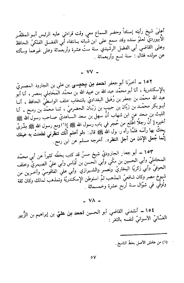 152 - أخبرنَا أَبُو جَعْفَر أَحْمد بْنُ يَحْيَى بْنِ عَلِيِّ بْنِ الْجَارُودِ الْمِصْرِيُّ بِالْإِسْكَنْدَرِيَّةِ أَنَا أَبُو مُحَمَّدٍ عَبْدُ اللَّهِ بْنُ عُبَيْدِ اللَّهِ بْنِ مُحَمَّدٍ الْمَحَامِلِيُّ بِمِصْرَ أَنَا أَبُو عَبْدِ اللَّهِ مُحَمَّدُ بْنُ جَعْفَرِ بْنِ رُهَيْلٍ الْبَغْدَادِيُّ بِانْتِخَابِ خَلَفٍ الْوَاسِطِيِّ الْحَافِظِ أَنَا أَبُو بَكْرٍ مُحَمَّدُ بْنُ زَبَّانَ بْنِ حَبِيبِ بْنِ زَبَّانَ الْحَضْرَمِيُّ ثَنَا مُحَمَّدُ بْنُ رُمْحٍ أَنَا اللَّيْثُ بْنُ سَعْدٍ عَنِ ابْنِ شِهَابٍ أَنَّ سَهْلَ بْنَ سَعْدٍ السَّاعِدِيَّ صَاحِبَ رَسُولِ اللَّهِ صَلَّى اللَّهُ عَلَيْهِ وَسَلَّمَ أَخْبَرَهُ أَنَّ رَجُلًا اطَّلَعَ مِنْ حُجْرٍ فِي بَابِ رَسُولِ اللَّهِ صَلَّى اللَّهُ عَلَيْهِ وَسَلَّمَ وَمَعَ رَسُولِ اللَّهِ صَلَّى اللَّهُ عَلَيْهِ وَسَلَّمَ مِدْرًى يَحُكُّ بِهَا رَأْسَهُ فَلَمَّا رَآهُ رَسُولُ اللَّهِ صَلَّى اللَّهُ عَلَيْهِ وَسَلَّمَ قَالَ لَوْ أَعْلَمُ أَنَّكَ تَنْظُرُنِي لَطَعَنْتُ بِهِ عَيْنَكَ إِنَّمَا جُعِلَ الْإِذْنُ مِنْ أَجْلِ النَّظَرِ