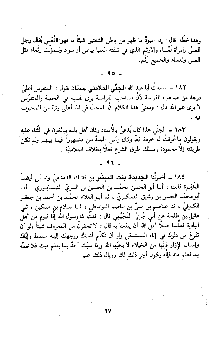 182 - سَمِعت أَبَا عَبْدِ اللَّهِ الْجِنِّيَّ الْمَلَامَتِيَّ بِهَمَذَانَ يَقُولُ الْمُتَفَرِّسُ أَعْلَى دَرَجَةً مِنْ صَاحِبِ الْفَرَاسَةِ لِأَنَّ صَاحِبَ الْفَرَاسَةِ يَرَى نَفْسَهُ فِي الْجُمْلَةِ وَالْمُتَفَرِّسُ لَا يَرَى غَيْرَ اللَّهِ قَالَ وَمَعْنَى هَذَا الْكَلَامِ أَنَّ الْمُحِبَّ فِي اللَّهِ أَعْلَى رُتْبَةً مِنَ الْمَحْبُوبِ فِيهِ