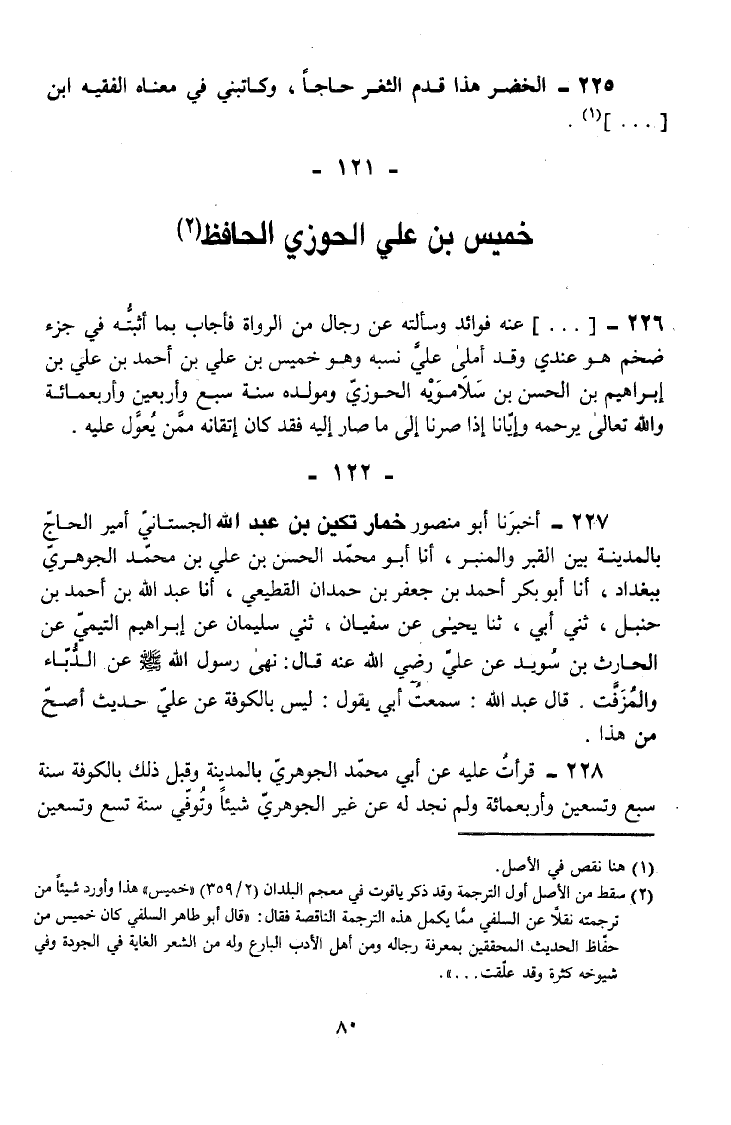 226 - عَنْهُ فَوَائِدُ وَسَأَلْتُهُ عَنْ رِجَالٍ مِنَ الرُّوَاةِ فَأَجَابَ بِمَا أَثْبَتُّهُ فِي جُزْءٍ ضَخْمٍ هُوَ عِنْدِي وَقَدْ أَمْلَى عَلَيَّ نَسَبَهُ وَهُوَ خَمِيسُ بْنُ عَلِيِّ بْنِ أَحْمَدَ بْنُ عَلِيِّ بْنِ إِبْرَاهِيمَ بْنِ الْحَسَنِ بْنِ سَلَامَوَيْهِ الْحَوْزِيُّ وَمَوْلِدُهُ سنة سبع وَأَرْبَعين وَأَرْبَعمِائَة وَاللَّهُ تَعَالَى يَرْحَمُهُ وَإِيَّانَا إِذَا صِرْنَا إِلَى مَا صَارَ إِلَيْهِ فَقَدْ كَانَ إِتْقَانُهُ مِمَّنْ يُعَوَّلُ عَلَيْهِ