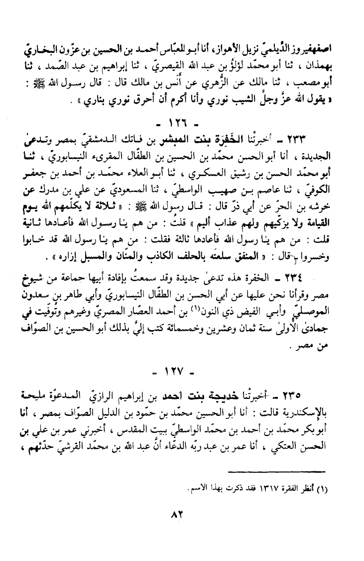 233 - أَخْبَرَتْنَا الْخَفِرَةُ بِنْتُ الْمُبَشِّرِ بْنِ فَاتِكٍ الدِّمَشْقِيِّ بِمِصْرَ وَتُدْعَى الْجُدَيْدَةُ أَنَا أَبُو الْحَسَنِ مُحَمَّدُ بْنُ الْحُسَيْنِ بْنِ الطَّفَّالِ الْمُقْرِئُ النَّيْسَابُورِيُّ ثَنَا أَبُو مُحَمَّدٍ الْحَسَنُ بْنُ رَشِيقٍ الْعَسْكَرِيُّ ثَنَا أَبُو الْعَلَاءِ مُحَمَّدُ بْنُ أَحْمَدَ بْنِ جَعْفَرٍ الْكُوفِيُّ ثَنَا عَاصِمُ بْنُ صُهَيْبٍ الْوَاسِطِيُّ ثَنَا الْمَسْعُودِيُّ عَنْ عَلِيِّ بْنِ مُدْرِكٍ عَنْ خَرَشَةَ بْنِ الْحَرِّ عَنْ أَبِي ذَرٍّ قَالَ قَالَ رَسُولُ اللَّهِ صَلَّى اللَّهُ عَلَيْهِ وَسَلَّمَ ثَلَاثَةٌ لَا يُكَلِّمُهُمُ اللَّهُ يَوْمَ الْقِيَامَةِ وَلَا يُزَكِّيهِمْ وَلَهُمْ عَذَابٌ أَلِيمٌ قُلْتُ مَنْ هُمْ يَا رَسُولَ اللَّهِ فَأَعَادَهَا ثَانِيَةً قُلْتُ مَنْ هُمْ يَا رَسُولَ اللَّهِ فَأَعَادَهَا ثَالِثَةً فَقُلْتُ مَنْ هُمْ يَا رَسُولَ اللَّهِ قَدْ خَابُوا وَخَسِرُوا قَالَ الْمُنْفِقُ سِلْعَتَهُ بِالْحَلِفِ الْكَاذِبِ وَالْمَنَّانُ وَالْمُسْبِلُ إِزَارَهُ